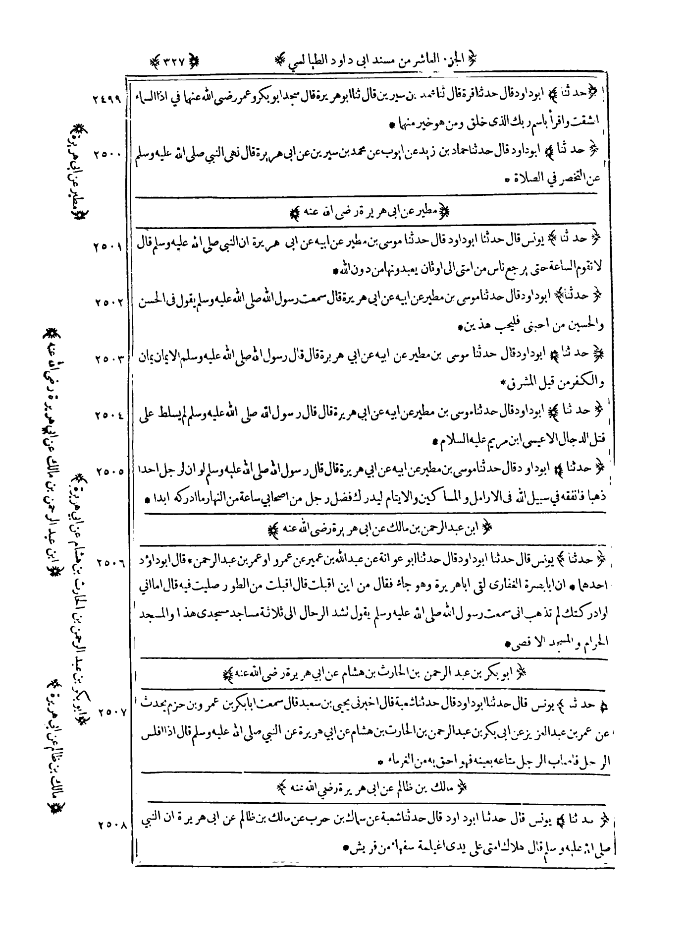 2501 - حدثنا يونس قال حدثنا أبو داود قال حدثنا موسى بن مطير عن أبيه عن أبي هريرة ان النبي صلى الله عليه و سلم قال : لا تقوم الساعة حتى يرجع ناس من امتى الى اوثان يعبدونها من دون الله