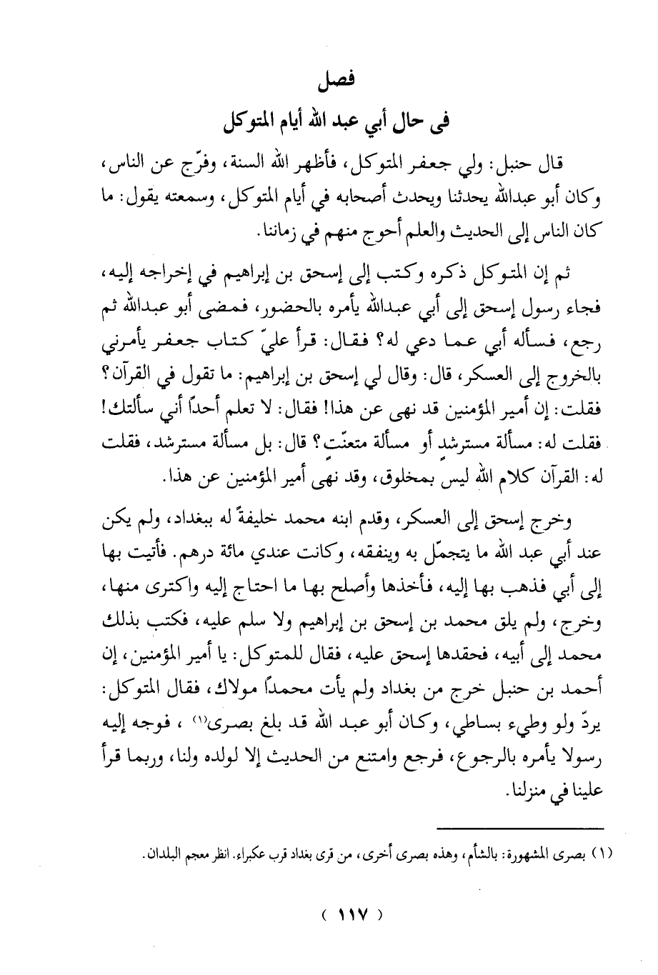 وخرج إسحق إلى العسكر، وقدم ابنه محمد خليفةً له ببغداد، ولم يكن عند أبي عبد الله ما يتجمّل به وينفقه، وكانت عندي مائة درهم. فأتيت بها إلى أبي فذهب بها إليه، فأخذها وأصلح بها ما احتاج إليه واكترى منها، وخرج، ولم يلق محمد بن إسحق بن إبراهيم ولا سلم عليه، فكتب بذلك محمد إلى أبيه، فحقدها إسحق عليه، فقال للمتوكل: يا أمير المؤمنين، إن أحمد بن حنبل خرج من بغداد ولم يأت محمدًا مولاك، فقال المتوكل: يردّ ولو وطيء بساطي، وكان أبو عبد الله قد بلغ بصرى (¬1)، فوجه إليه رسولا يأمره بالرجوع، فرجع وامتنع من الحديث إلا لولده ولنا، وربما قرأ علينا في منزلنا.