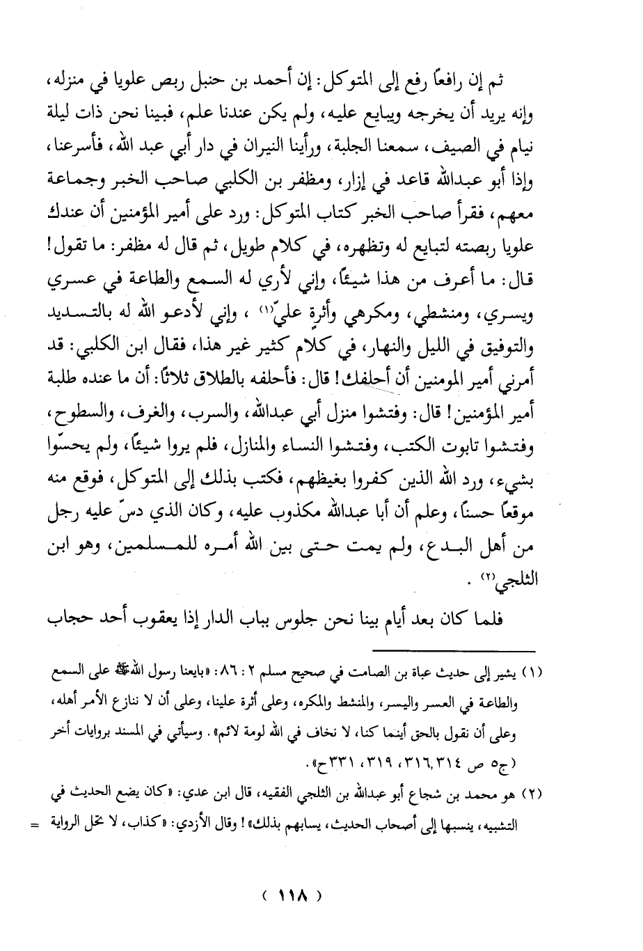 ثم إن رافعًا رفع إلى المتوكل: إن أحمد بن حنبل ربص علويا في منزله، وإنه يريد أن يخرجه ويبايع عليه، ولم يكن عندنا علم، فبينا نحن ذات ليلة نيام في الصيف، سمعنا الجلبة، ورأينا النيران في دار أبي عبد الله، فأسرعنا، وإذا أبو عبد الله قاعد في إزار، ومظفر بن الكلبي صاحب الخبر وجماعة معهم، فقرأ صاحب الخبر كتاب المتوكل: ورد على أمير المؤمنين أن عندك علويا ربصته لتبايع له وتظهره، في كلام طويل، ثم قال له مظفر: ماتقول! قال: ما أعرف من هذا شيئًا، وإني لأري له السمع والطاعة في عسري ويسري، ومنشطي، ومكرهي وأثرةٍ عليّ (¬1)، وإني لأدعو الله له بالتسديد والتوفيق في الليل والنهار، في كلام كثير غير هذا، فقال ابن الكلبي: قد أمرني أمير المومنين أن أحلفك! قال: فأحلفه بالطلاق ثلاثًا: أن ما عنده طلبة أمير المؤمنين! قال: وفتشوا منزل أبي عبد الله، والسرب، والغرف، والسطوح، وفتشوا تابوت الكتب، وفتشوا النساء والمنازل، فلم يروا شيئًا، ولم يحسّوا بشئ، ورد الله الذين كفروا بغيظهم، فكتب بذلك إلى المتوكل، فوقع منه موقعًا حسنًا، وعلم أن أبا عبد الله مكذوب عليه، وكان الذي دسّ عليه رجل من أهل البدع، ولم يمت حتى بين الله أمره للمسلمين، وهو ابن الثلجي (¬2).
