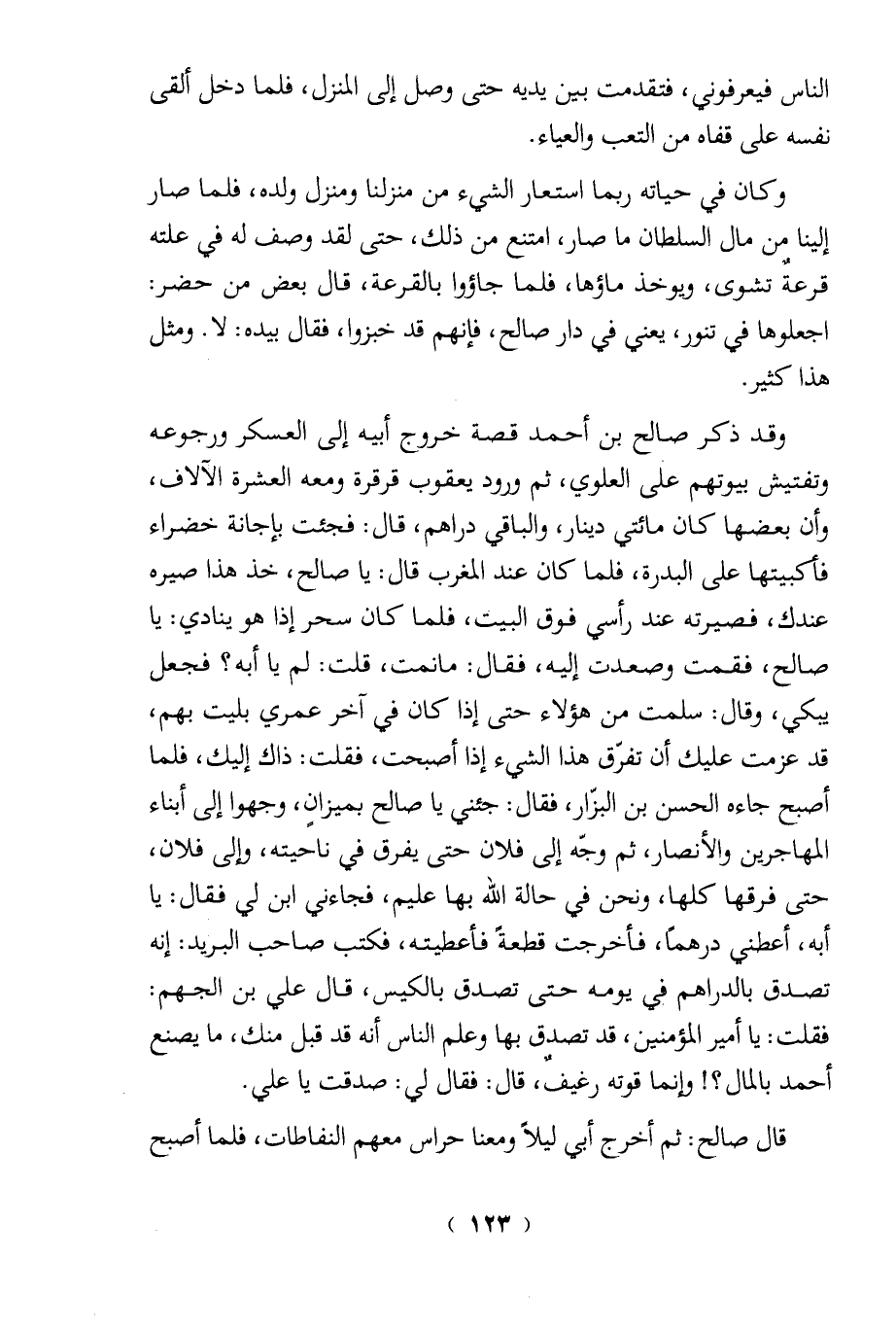 وقد ذكر صالح بن أحمد قصة خروج أبيه إلى العسكر ورجوعه وتفتيش بيوتهم على العلوي، ثم ورود يعقوب قرقرة ومعه العشرة الآلاف، وأن بعضها كان مائتي دينار، والباقي دراهم، قال: فجئت بإجانة خضراء فأكتبها على البدرة، فلما كان عند المغرب قال: يا صالح، خذ هذا صيره عندك، فصيرته عند رأسي فوق البيت، فلما كان سحر إذا هو ينادي: يا صالح، فقمت وصعدت إليه، فقال: مانمت، قلت: لم يا أبه؟ فجعل يبكي، وقال: سلمت من هؤلاء حتى إذا كان في آخر عمري بليت بهم، قد عزمت عليك أن تفرق هذا الشيء إذا أصبحت، فقلت: ذاك إليك، فلما أصبح جاءه الحسن بن البزَّار، فقال: جئني يا صالح بميزانٍ، وجهوا إلى أبناء المهاجرين والأنصار، ثم وجّه إلى فلان حتى يفرق في ناحيته، وإلى فلان، حتى فرقها كلها، ونحن في حالة الله بها عليم، فجاءني ابن لي فقال: يا أبه، أعطنى درهمًا، فأخرجت قطعةً فأعطيته، فكتب صاحب البريد: إنه تصدق بالدراهم في يومه حتى تصدق بالكيس، قال علي بن الجهم: فقلت: يا أمير المؤمنين، قد تصدق بها وعلم الناس أنه قد قبل منك، ما يصنع أحمد بالمال؟! وإنما قوته رغيف، قال: فقال لي: صدقت يا علي.