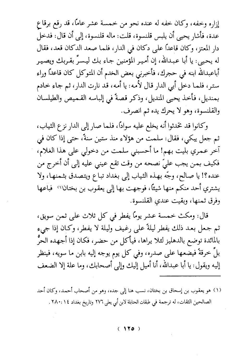 إزاره وخفه، وكان خفه له عنده نحو من خمسة عشر عامًا، قد رقع برقاع عدة، فأشار يحيى أن يلبس قلنسوة، قلت: ماله قلنسوة، إلى أن قال: فدخل دار المعتز، وكان قاعدًا على دكان في الدار، فلما صعد الدكان قعد، فقال له يحيى: يا أبا عبد الله، إن أمير المؤمنين جاء بك ليسرَّ بقربك ويصير أبا عبد الله ابنه في حجرك، فأخبرني بعض الخدم أن المتوكل كان قاعدًا وراء ستر، فلما دخل أبي الدار قال لأمه: يا أمه، قد نارت الدار، ثم جاء خادم بمنديل، فأخذ يحيى المنديل، وذكر قصةً في إلباسه القميص والطيلسان والقلنسوة، وهو لا يحرك يده ثم انصرف.