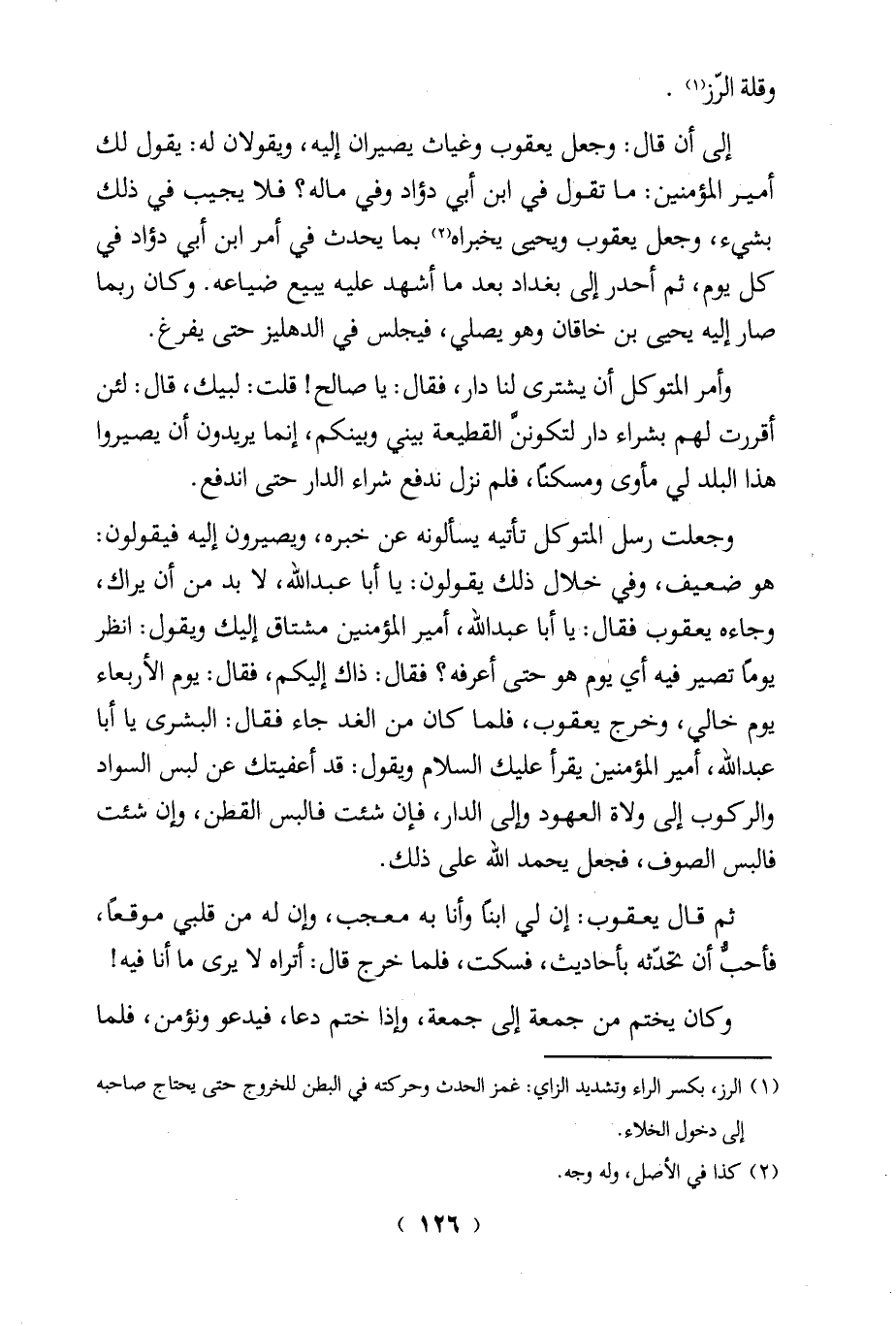وجعلت رسل المتوكل تأتيه يسألونه عن خبره، ويصيرون إليه فيقولون: هو ضعيف، وفى خلال ذلك يقولون: يا أبا عبد الله، لا بد من أن يراك، وجاءه يعقوب فقال: يا أبا عبد الله، أمير المؤمنين مشتاق إليك ويقول: انظر يومًا تصير فيه أي يوم هو حتى أعرفه؟ فقال: ذاك إليكم، فقال: يوم الأربعاء يوم خالي، وخرج يعقوب، فلما كان من الغد جاء فقال: البشرى يا أبا عبد الله، أمير المؤمنين يقرأ عليك السلام ويقول: قد أعفيتك عن لبس السواد والركوب إلى ولاة العهود وإلى الدار، فإن شئت فالبس القطن، وإن شئت فالبس الصوف، فجعل يحمد الله على ذلك.