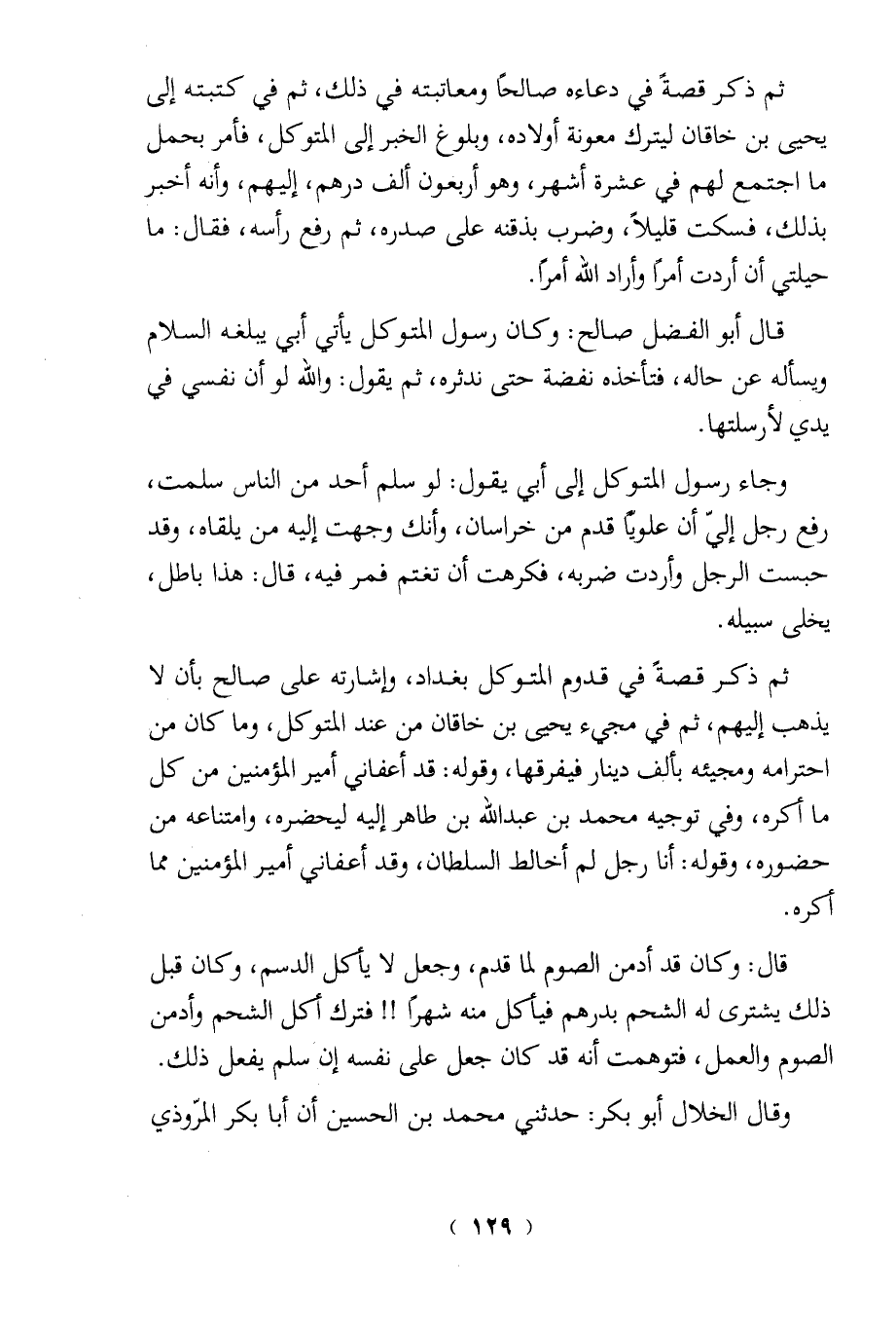 ثم ذكر قصةً في قدوم المتوكل بغداد، وإشارته على صالح بأن لا يذهب إليهم، ثم في مجيء يحيى بن خاقان من عند المتوكل، وما كان من احترامه ومجيئه بألف دينار فيفرقها، وقوله: قد أعفاني أمير المؤمنين من كل ما أكره، وفى توجيه محمد بن عبد الله بن طاهر إليه ليحضره، وامتناعه من حضوره، وقوله: أنا رجل لم أخالط السلطان، وقد أعفاني أمير المؤمنين مما أكره.