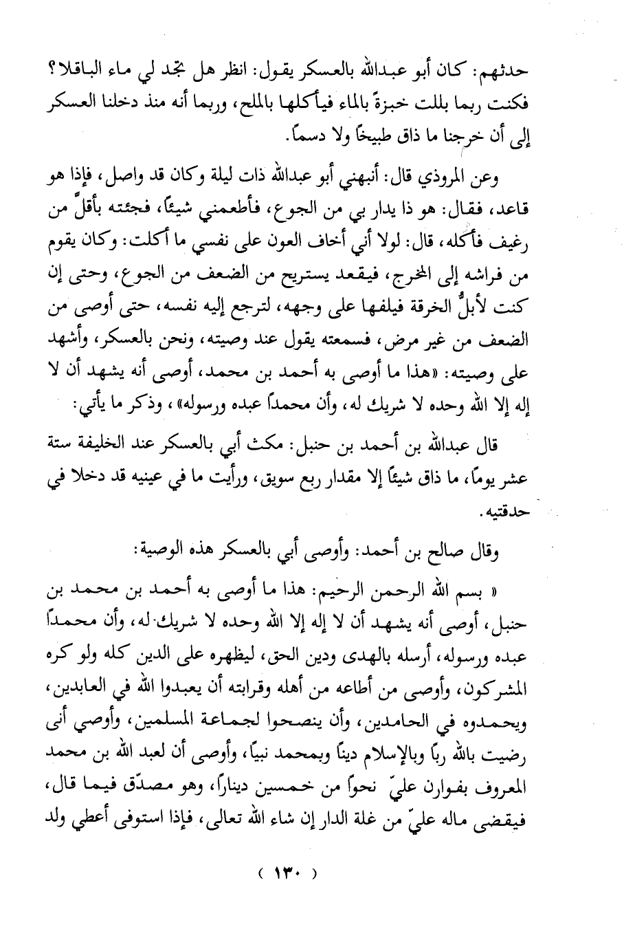 وعن المروذي قال: أنبهني أبو عبد الله ذات ليلة وكان قد واصل، فإذا هو قاعد، فقال: هو ذا يدار بي من الجوع، فأطعمني شيئاً، فجئته بأقلَّ من رغيف فأكله، قال: لولا أني أخاف العون على نفسي ما أكلت: وكان يقوم من فراشه إلى المخرج، فيقعد يستريح من الضعف من الجوع، وحتى إن كنت لأبلُّ الخرقة فيلفها على وجهه، لترجع إليه نفسه، حتى أوصى من الضعف من غيرمرض، فسمعته يقول عند وصيته، ونحن بالعسكر، وأشهد على وصيته: "هذا ما أوصى به أحمد بن محمد، أوصى أنه يشهد أن لا إله إلا الله وحده لا شريك له، وأن محمدًا عبده ورسوله"، وذكر ما يأتي: