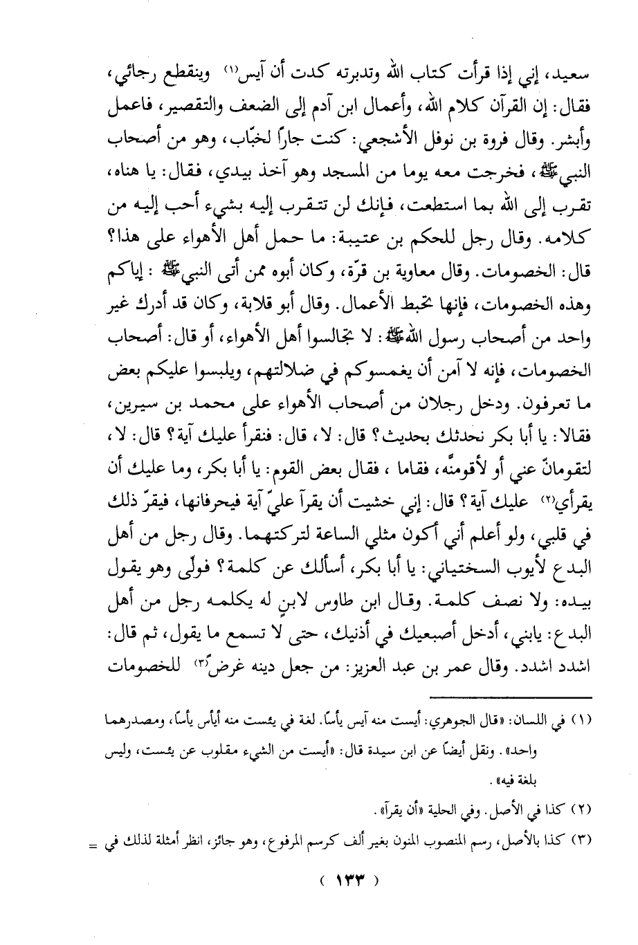 سعيد، إني إذا قرأت كتاب الله وتدبرته كدت أن آيس (¬1) وينقطع رجائي، فقال: إن القرآن كلام الله، وأعمال ابن آدم إلى الضعف والتقصير، فاعمل وأبشر. وقال فروة بن نوفل الأشجعي: كنت جارًا لخبّاب، وهو من أصحاب النبى - صلى الله عليه وسلم -، فخرجت معه يوما من المسجد وهو آخذ بيدي، فقال: يا هناه، تقرب إلى الله بما استطعت، فإنك لن تتقرب إليه بشيء أحب إليه من كلامه. وقال رجل للحكم بن عتيبة: ما حمل أهل الأهواء على هذا؟ قال: الخصومات. وقال معاوية بن قرَّة، وكان أبوه ممن أتى النبى - صلى الله عليه وسلم: إياكم وهذه الخصومات، فإنها تحبط الأعمال. وقال أبو قلابة، وكان قد أدرك غير واحد من أصحاب رسول الله - صلى الله عليه وسلم -: لا تجالسوا أهل الأهواء، أو قال: أصحاب الخصومات، فإنه لا آمن أن يغمسوكم في ضلالتهم، ويلبسوا عليكم بعض ما تعرفون. ودخل رجلان من أصحاب الأهواء على محمد بن سيرين، فقالا: يا أبا بكر نحدثك بحديث؟ قال: لا، قال: فنقرأ عليك آية؟ قال: لا، لتقومانّ عني أو لأقومنَّه، فقاما، فقال بعض القوم: يا أبا بكر، وما عليك أن يقرأي (¬2) عليك آية؟ قال: إني خشيت أن يقرآ عليّ آية فيحرفانها، فيقرّ ذلك في قلبي، ولو أعلم أني أكون مثلي الساعة لتركتهما. وقال رجل من أهل البدع لأيوب السختياني: يا أبا بكر، أسألك عن كلمة؟ فولَّى وهو يقول بيده: ولا نصف كلمة. وقال ابن طاوس لابنٍ له يكلمه رجل من أهل البدع: يابني، أدخل أصبعيك في أذنيك، حتى لا تسمع ما يقول، ثم قال: اشدد اشدد. وقال عمر بن عبد العزيز: من جعل دينه غرضً (¬3) للخصومات