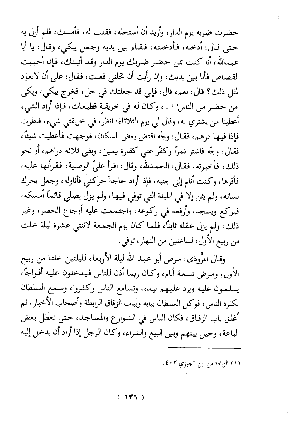 حضرت ضربه يوم الدار، وأريد أن أستحله، فقلت له، فأمسك، فلم أزل به حتى قال: أدخله، فأدخلته، فقام بين يديه وجعل يبكي، وقال: يا أبا عبد الله، أنا كنت ممن حضر ضربك يوم الدار وقد أتيتك، فإن أحببت القصاص فأنا بين يديك، وإن رأيت أن تحلنى فعلت، فقال: على أن لاتعود لمثل ذلك؟ قال: نعم، قال: فإني قد جعلتك في حل، فخرج يبكي، وبكى من حضر من الناس (¬1)]، وكان له في خريقةٍ قطيعاتٌ، فإذا أراد الشيء أعطينا من يشتري له، وقال لي يوم الثلاثاء: انظر، في خريقتي شيء، فنظرت فإذا فيها درهم، فقال: وجّه اقتض بعض السكان، فوجهت فأعطيت شيئًا، فقال: وجّه فاشتر تمراً وكفَّر عني كفارة يمين، وبقي ثلاثة دراهم، أو نحو ذلك، فأخبرته، فقال: الحمد لله، وقال: اقرأ عليّ الوصية، فقرأتها عليه، فأقرها، وكنت أنام إلى جنبه، فإذا أراد حاجةً حركني فأناوله، وجعل يحرك لسانه، ولم يئن إلا في الليلة التي توفي فيها، ولم يزل يصلي قائمًا أمسكه، فيركع ويسجد، وأرفعه في ركوعه، واجتمعت عليه أوجاع الحصر، وغير ذلك، ولم يزل عقله ثابتًا، فلما كان يوم الجمعة لاثنتى عشرة ليلة خلت من ربيع الأول، لساعتين من النهار، توفي.