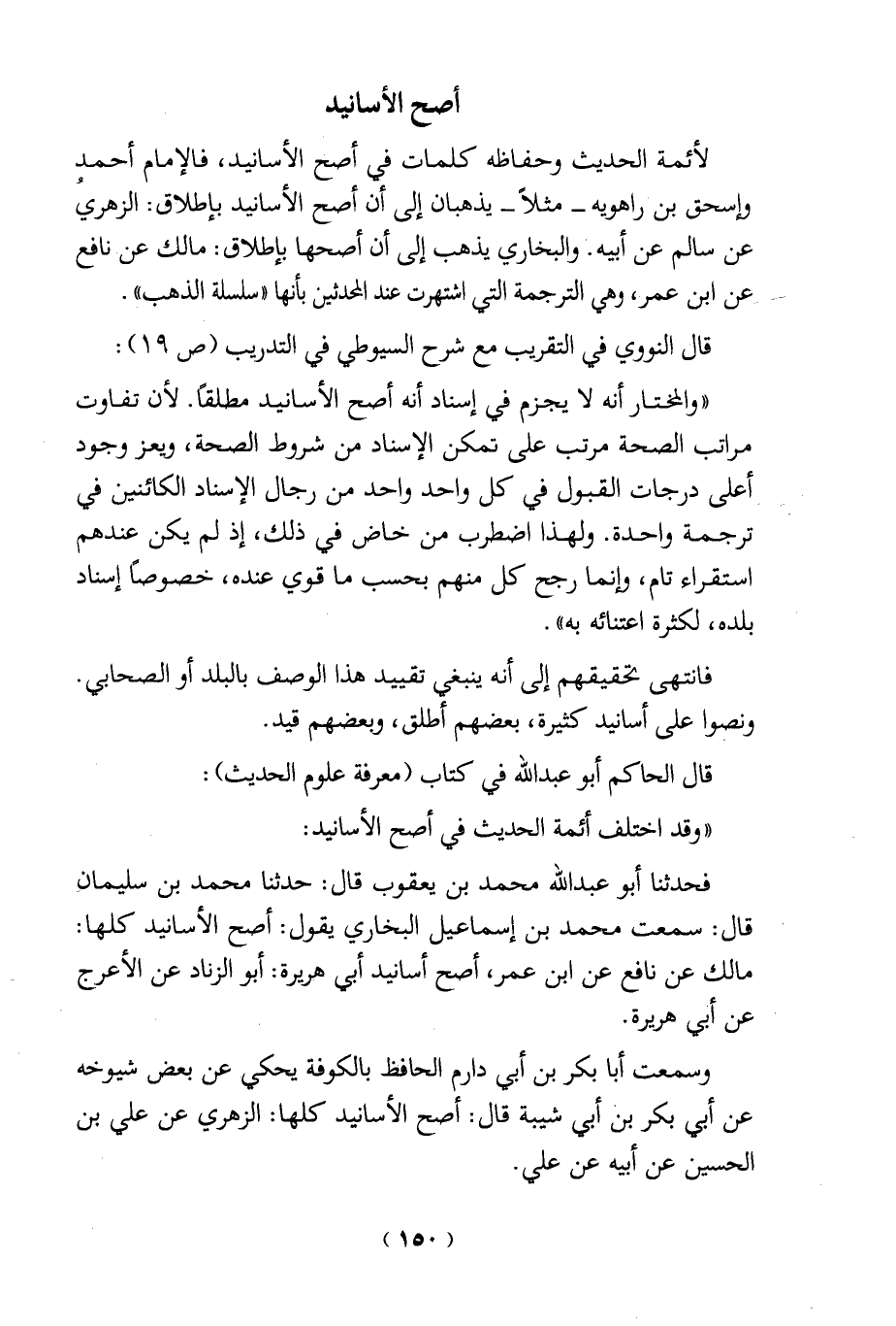 لأئمة الحديث وحفاظه كلمات في أصح الأسانيد، فالإمام أحمد! واسحق بن راهويه- مثلاً- يذهبان إلى أن أصح الأسانيد بإطلاق: الزهري عن سالم عن أبيه. والبخاري يذهب إلى أن أصحها بإطلاق: مالك عن نافع عن ابن عمر، وهي الترجمة التي اشتهرت عند المحدثين بأنها "سلسلة الذهب". قال النووي في التقريب مع شرح السيوطي في التدريب (ص 19): "والمختار أنه لا يجزم في إسناد أنه أصح الأسانيد مطلقًا. لأن تفاوت مراتب الصحة مرتب على تمكن الإسناد من شروط الصحة، ويعز وجود أعلى درجات القبول في كل واحد واحد من رجال الإسناد الكائنين في ترجمة واحدة. ولهذا اضطرب من خاض في ذلك، إذ لم يكن عندهم استقراء تام، وانما رجح كل منهم بحسب ما قوي عنده، خصوصًا إسناد بلده، لكثرة اعتنائه به".