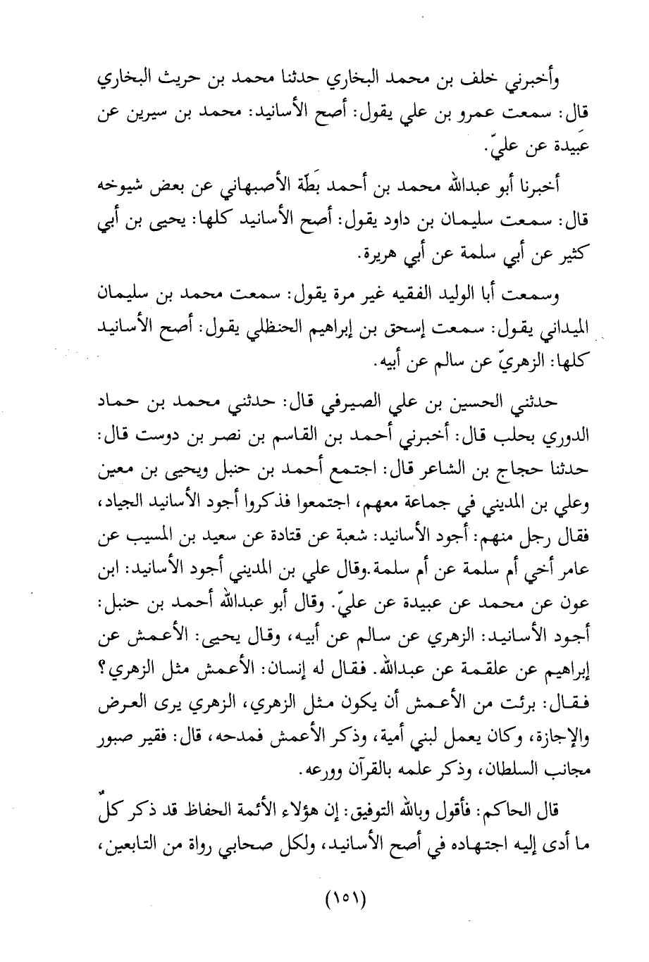 قال الحاكم: فأقول وبالله التوفيق: إن هؤلاء الأئمة الحفاظ قد ذكر كلٌ ما أدى إليه اجتهاده في أصح الأسانيد، ولكل صحابي رواة من التابعين،