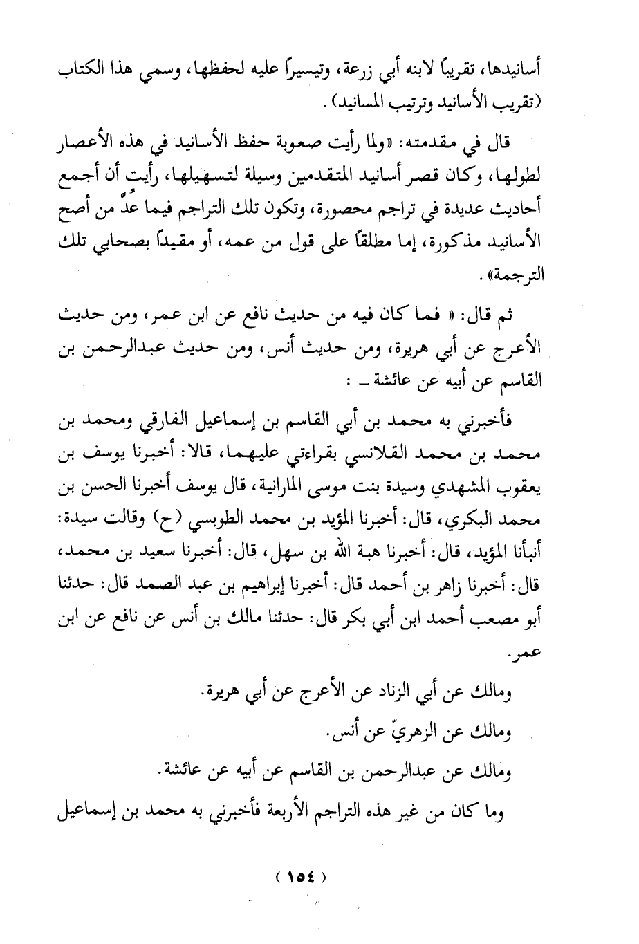 ثم قال: "فما كان فيه من حديث نافع عن ابن عمر، ومن حديث الأعرج عن أبى هريرة، ومن حديث أنس، ومن حديث عبد الرحمن بن القاسم عن أبيه عن عائشة-: