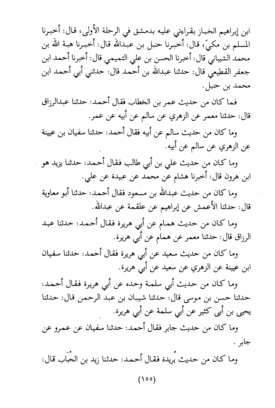 ابن إبراهيم الخباز بقراءتي عليه بدمشق في الرحلة الأولى، قال: أخبرنا المسلم بن مكي، قال: أخبرنا حنبل بن عبد الله قال: أخبرنا هبة الله بن محمد الشيباني قال: أخبرنا الحسن بن علي التميمي قال: أخبرنا أحمد ابن جعفر القطيعي قال: حدثنا عبد الله بن أحمد قال: حدثنى أبي أحمد ابن محمد بن حنبل.