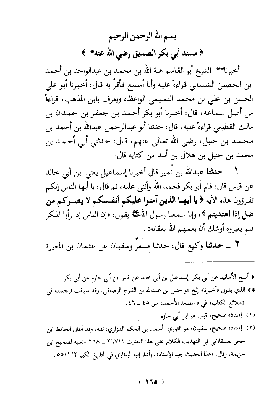 1 - حدثنا عبد الله بن نمير قال أخبرنا إسماعيل يعني ابن أبي خالد عن قيس قال: قام أبو بكر فحمد الله وأثنى عليه، ثم قال: يا أيها الناس إنكم تقرؤون هذه الآية {يَا أَيُّهَا الَّذِينَ آمَنُوا عَلَيْكُمْ أَنْفُسَكُمْ لَا يَضُرُّكُمْ مَنْ ضَلَّ إِذَا اهْتَدَيْتُمْ} إنا سمعنا رسول الله - صلى الله عليه وسلم - يقول: "إن الناس إذا رأوا المنكر فلم يغيروه أوشك أن يعمهم الله بعقابه".