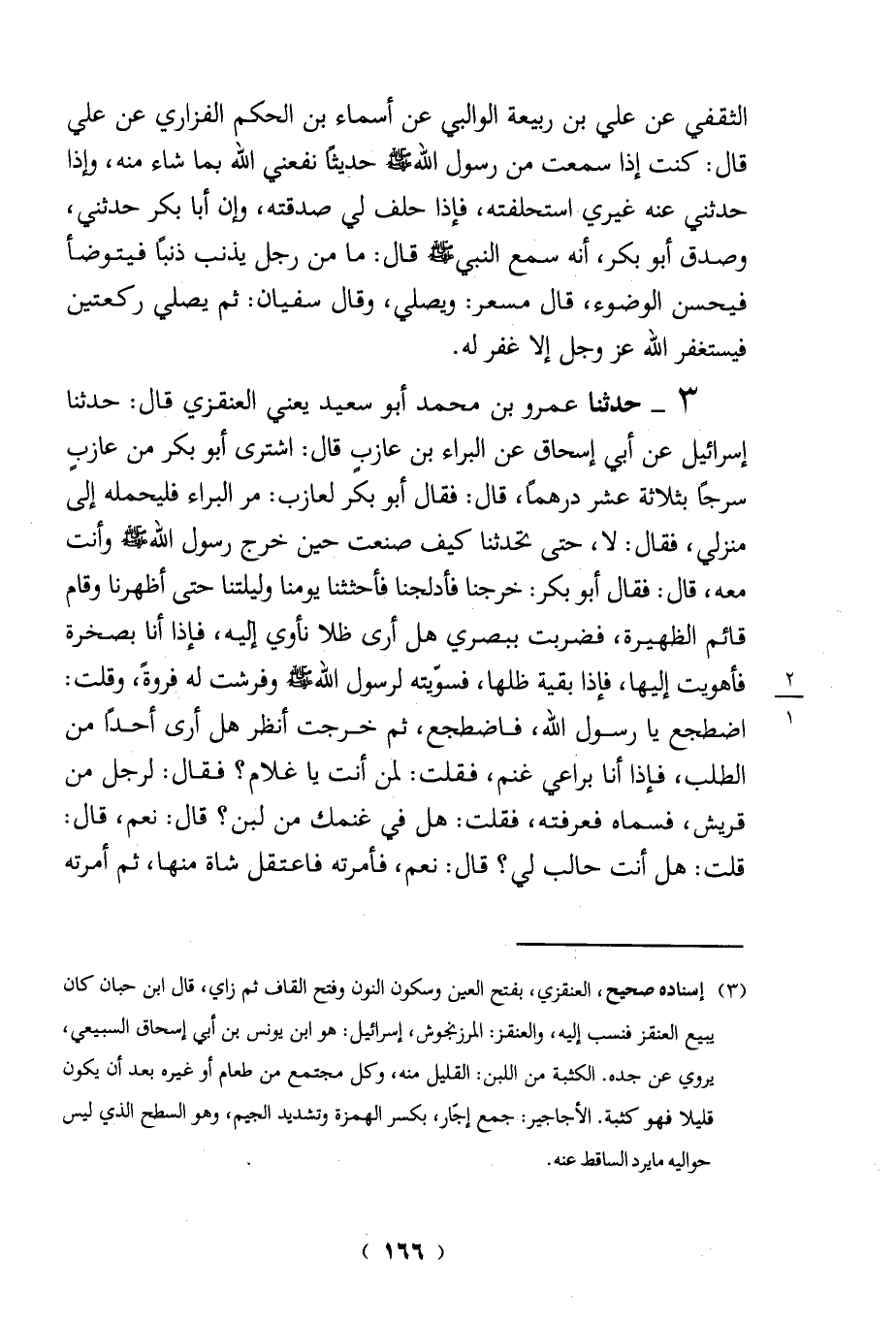 3 - حدثنا عمرو بن محمد أبو سعيد يعني العنقزي قال: حدثنا إسرائيل عن أبي إسحاق عن البراء بن عازبٍ قال: اشترى أبو بكر من عازبٍ سرجًا بثلاثة عشر درهمًا، قال: فقال أبو بكر لعازب: مر البراء فليحمله إلى منزلي، فقال: لا، حتى تحدثنا كيف صنعت حين خرج رسول الله - صلى الله عليه وسلم - وأنت معه، قال: فقال أبو بكر: خرجنا فأدلجنا فأحثثنا يومنا وليلتنا حتى أظهرنا وقام قائم الظهيرة، فضربت ببصري هل أرى ظلا نأوي إليه، فإذا أنا بصخرة فأهويت إليها، فإذا بقية ظلها، فسوَّيته لرسول الله - صلى الله عليه وسلم - وفرشت له فروةً، وقلت: اضطجع يا رسول الله، فاضطجع، ثم خرجت أنظر هل أرى أحداً من الطلب، فإذا أنا براعي غنم، فقلت: لمن أنت يا غلام؟ فقال: لرجل من قريش، فسماه فعرفته، فقلت: هل في غنمك من لبن؟ قال: نعم، قال: قلت: هل أنت حالب لي؟ قال: نعم، فأمرته فاعتقل شاة منها، ثم أمرته