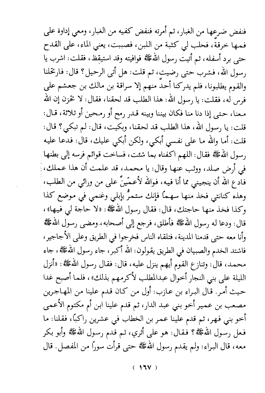 فنفض ضرعها من الغبار، ثم أمرته فنفض كفيه من الغبار، ومعي إداوة على فمها خرقةٌ، فحلب لي كثبة من اللبن، فصببت، يعني الماء، على القدح حتى برد أسفله، ثم أتيت رسول الله - صلى الله عليه وسلم - فوافيته وقد استيقظ، فقلت: اشرب يا رسول الله، فشرب حتى رضيت، ثم قلت: هل أتى الرحيل؟ قال: فارتحلنا والقوم يطلبونا، فلم يدركنا أحدٌ منهم إلا سراقة بن مالك بن جعشم على فرس له، فقلت: يا رسول الله: هذا الطلب قد لحقنا، فقال: لا تحزن إن الله معنا، حتى إذا دنا منا فكان بيننا وبينه قدر رمح أو رمحين أو ثلاثة، قال: قلت: يا رسول الله، هذا الطلب قد لحقنا، وبكيت، قال: لم تبكي؟ قال: قلت: أما والله ما على نفسي أبكي، ولكن أبكي عليك، قال: فدعا عليه رسول الله - صلى الله عليه وسلم - فقال: اللهم اكفناه بما شئت، فساخت قوائم فرسه إلى بطنها في أرض صلد، ووثب عنها وقال: يا محمد، قد علمت أن هذا عملك، فادع الله أن ينجينى مما أنا فيه، فوالله لأعمَّينَّ على من ورائي من الطلب، وهذه كنانتي فخذ منها سهمًا فإنك ستمرُّ بإبلي وغنمي في موضع كذا وكذا فخذ منها حاجتك، قال: فقال رسول الله - صلى الله عليه وسلم -: "لا حاجة لي فيها، قال: ودعا له رسول الله - صلى الله عليه وسلم - نأطلق، فرجع إلى أصحابه،. ومضى رسول - صلى الله عليه وسلم - وأنا معه حتى قدمنا المدينة، فتلقاه الناس فخرجوا في الطريق وعلى الأجاجير، فاشتد الخدم والصبيان في الطريق يقولون: الله أكبر، جاء رسول الله - صلى الله عليه وسلم -، جاء محمد، قال: وتنازع القوم أيهم ينزل عليه، قال: فقال رسول الله - صلى الله عليه وسلم -: "أنزل الليلة على بنى النجار أخوال عبد المطلب لأكرمهم بذلك"، فلما أصبح غدا حيث أمر. قال البراء بن عازب: أول من كان قدم علينا من المهاجرين مصعب بن عمير أخو بني عبد الدار، ثم قدم علينا ابن أم مكتوم الأعمى أخو بني فهر، ثم قدم علينا عمر بن الخطاب في عشرين راكبًا، فقلنا: ما فعل رسول الله - صلى الله عليه وسلم -؟ فقال: هو على أثري، ثم قدم رسول الله - صلى الله عليه وسلم - وأبو بكر معه، قال البراء: ولم يقدم رسول الله - صلى الله عليه وسلم - حتى قرأت سورًا من المفصل. قال