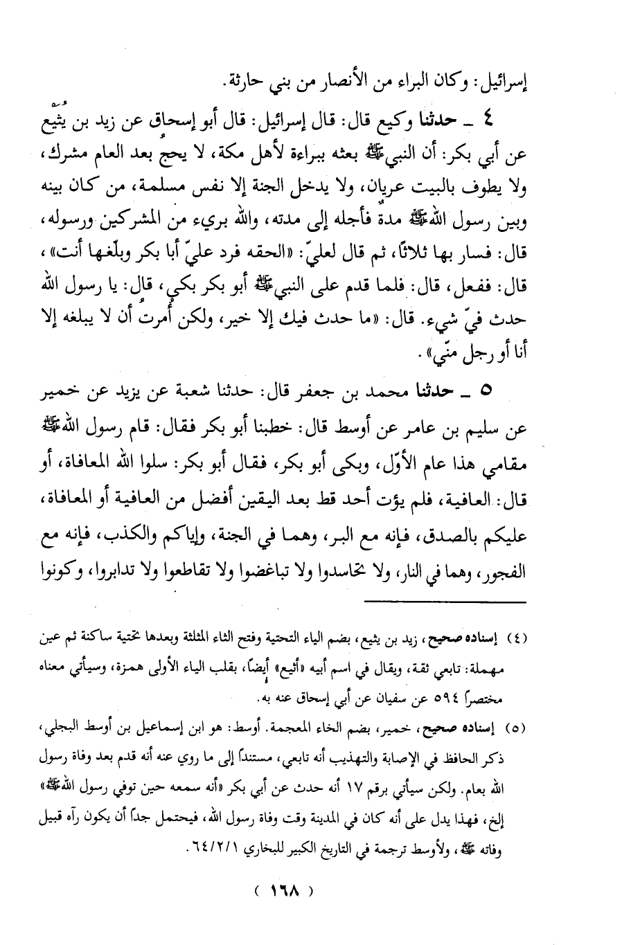 4 - حدثنا وكيع قال: قال إسرائيل: قال أبو إسحاق عن زيد بن يُثَيْع عن أبي بكر: أن النبي - صلى الله عليه وسلم - بعثه ببراءة لأهل مكة، لا يحجُ بعد العام مشرك، ولا يطوف بالبيت عريان، ولا يدخل الجنة إلا نفس مسلمة، من كان بينه وبين رسول الله - صلى الله عليه وسلم - مدةٌ فأجله إلى مدته، والله بريء من المشركين ورسوله، قال: فسار بها ثلاثًا، ثم قال لعليّ: "الحقه فرد عليّ أبا بكر وبلَّغها أنت"، قال: ففعل، قال: فلما قدم على النبي - صلى الله عليه وسلم - أبو بكر بكي، قال: يا رسول الله حدث فيّ شيء. قال: "ما حدث فيك إلا خير، ولكن أمرتُ أن لا يبلغه إلا أنا أو رجل مني".