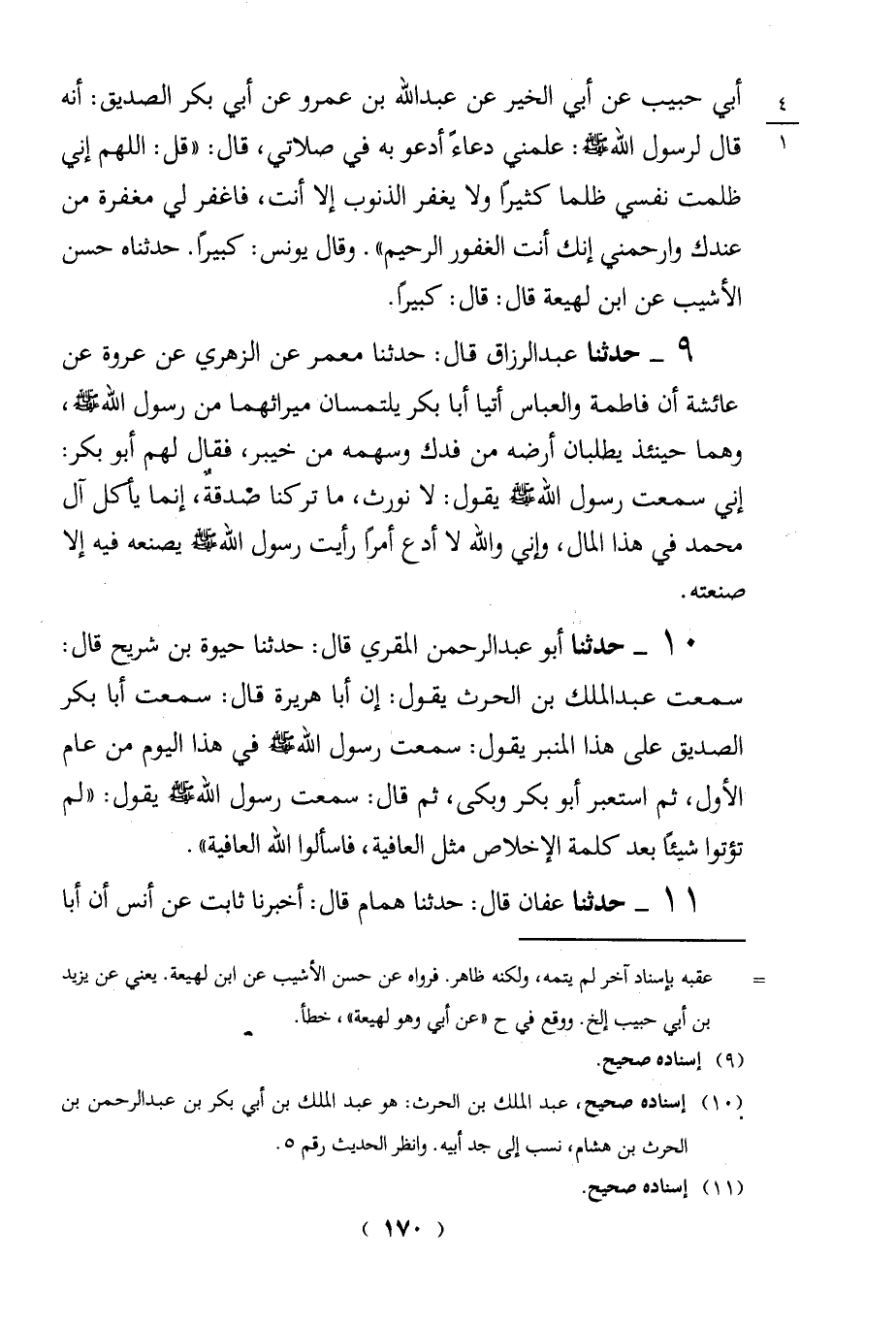 أبي حبيب عن أبي الخير عن عبد الله بن عمرو عن أبي بكر الصديق: أنه قال لرسول الله - صلى الله عليه وسلم -: علمني دعاءً أدعو به في صلاتي، قال: "قل: اللهم إني ظلمت نفسي ظلما كثيرًا ولا يغفر الذنوب إلا أنت، فاغفر لي مغفرة من عندك وارحمني إنك أنت الغفور الرحيم". وقال يونس: كبيرًا. حدثناه حسن الأشيب عن ابن لهيعة قال: قال: كبيراً.
