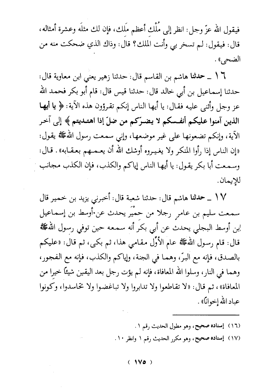 16 - حدثنا هاشم بن القاسم قال: حدثنا زهير يعنى ابن معاوية قال: حدثنا إسماعيل بن أبي خالد قال: حدثنا قيس قال: قام أبو بكر فحمد الله عز وجل وأثنى عليه فقال: يا أيها الناس إنكم تقرؤون هذه الآية: {يَا أَيُّهَا الَّذِينَ آمَنُوا عَلَيْكُمْ أَنْفُسَكُمْ لَا يَضُرُّكُمْ مَنْ ضَلَّ إِذَا اهْتَدَيْتُمْ} [المائدة: 105] وإلى آخر الآية، وإنكم تضعونها على غير موضعها، وإني سمعت رسول الله - صلى الله عليه وسلم - يقول: "إن الناس إذا رأوا المنكر ولا يغيروه أوشك الله أن يعمهم بعقابه". قال: وسمعت أبا بكر يقول: يا أيها الناس إياكم والكذب، فإن الكذب مجانب للإيمان.