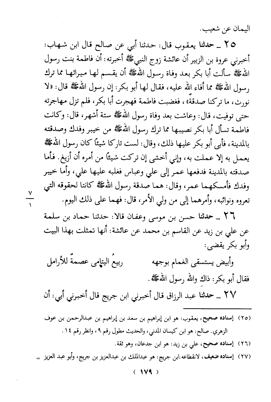 25 - حدثنا يعقوب قال: حدثنا أبي عن صالح قال ابن شهاب: أخبرني عروة بن الزبير أن عائشة زوج النبي - صلى الله عليه وسلم - أخبرته: أن فاطمة بنت رسول الله - صلى الله عليه وسلم - سألت أبا بكربعد وفاة رسول الله أن يقسم لها ميراثها مما ترك رسول الله - صلى الله عليه وسلم - مما أفاء الله عليه، فقال لها أبو بكر: إن رسول الله - صلى الله عليه وسلم - قال: "لا نورث، ما تركنا صدقة"، فغضبت فاطمة فهجرت أبا بكر، فلم تزل مهاجرته حتى توفيت، قال: وعاشت بعد وفاة رسول الله - صلى الله عليه وسلم - ستة أشهر، قال: وكانت فاطمة تسأل أبا بكر نصيبها مما ترك رسول الله - صلى الله عليه وسلم - من خيبر وفدك وصدقته بالمدينة، فأبى أبو بكر عليها ذلك، وقال: لست تاركا شيئاً كان رسول الله - صلى الله عليه وسلم - يعمل به إلا عملت به، وإني أخشى إن تركت شيئاً من أمره أن أزيغ. فأما صدقته بالمدينة فدفعها عمر إلى على وعباس فغلبه عليها على، وأما خيبر وفدك فأمسكهما عمر، وقال: هما صدقة رسول الله - صلى الله عليه وسلم - كانتا لحقوقه التي تعروه ونوائبه، وأمرهما إلى من ولي الأمر، قال: فهما على ذلك اليوم.