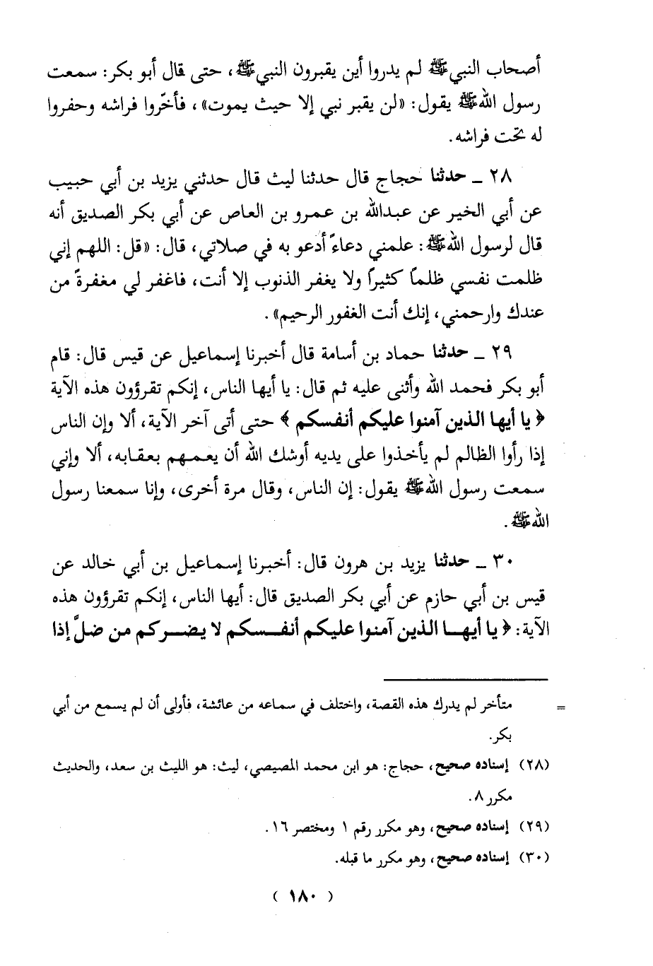 30 - حدثنا يزيد بن هرون قال: أخبرنا إسماعيل بن أبي خالد عن قيس بن أبي حازم عن أبي بكر الصديق قال: أيها الناس، إنكم تقرؤون هذه الآية: {يَا أَيُّهَا الَّذِينَ آمَنُوا عَلَيْكُمْ أَنْفُسَكُمْ لَا يَضُرُّكُمْ مَنْ ضَلَّ إِذَا