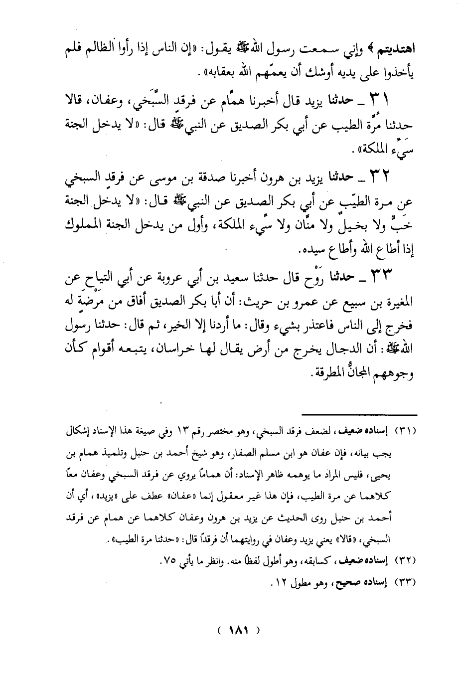 31 - حدثنا يزيد قال أخبرنا همام عن فرقد السَّبَخي، وعفان، قالا حدثنا مُرَّة الطيب عن أبي بكر الصديق عن النبي - صلى الله عليه وسلم - قال: "لا يدخل الجنة سَيء الملكة".