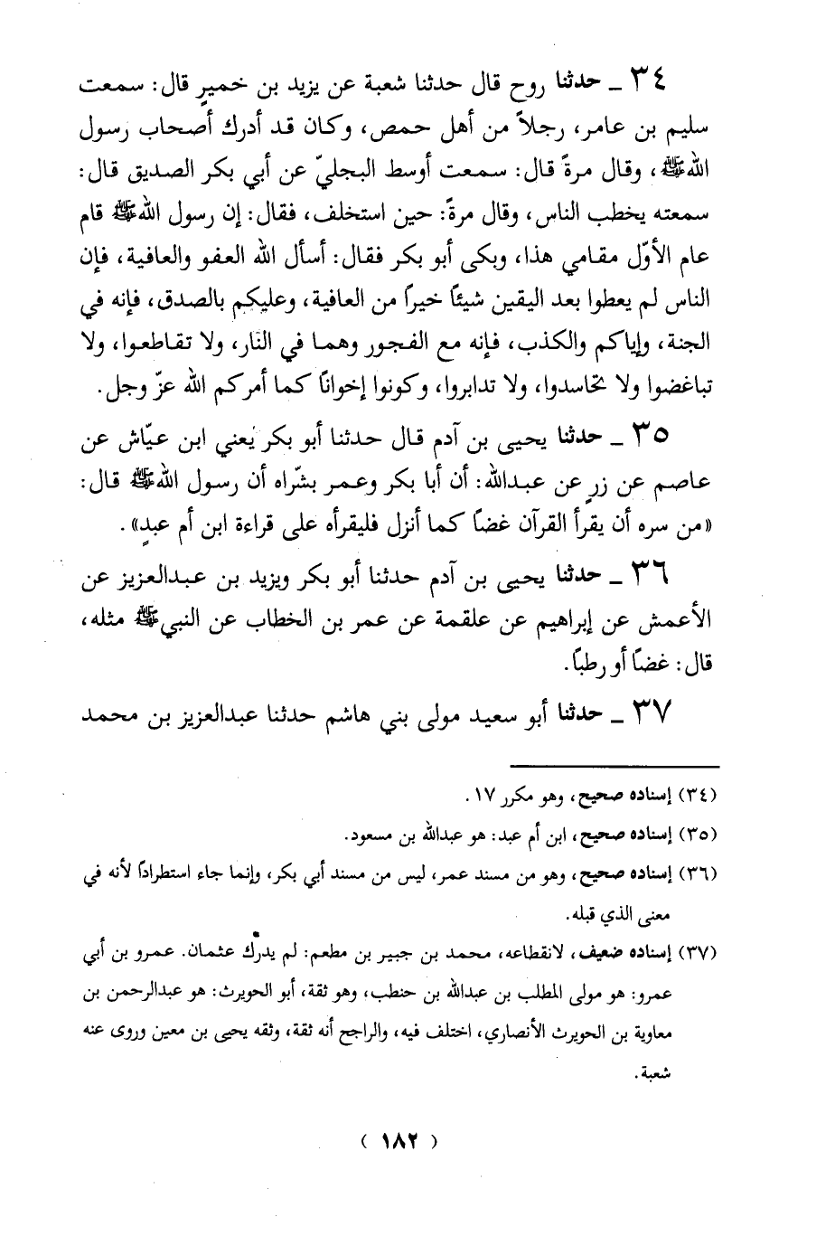 34 - حدثنا روح قال حدثنا شعبة عن يزيد بن خميرٍ قال: سمعت سليم بن عامر، رجلاً من أهل حمص، وكان قد أدرك أصحاب رسول الله - صلى الله عليه وسلم -، وقال مرةً قال: سمعت أوسط البجلي عن أبي بكر الصديق قال: سمعته يخطب الناس، وقال مرةً: حين استخلف، فقال: إن رسول الله - صلى الله عليه وسلم - قام عام الأوّل مقامي هذا، وبكى أبو بكر فقال: أسأل الله العفو والعافية، فإن الناس لم يعطوا بعد اليقين شيئاً خيراً من العافية، وعليكم بالصدق، فإنه في الجنة، وإياكم والكذب، فإنه مع الفجور وهما في النار، ولا تقاطعوا، ولا تباغضوا ولا تحاسدوا، ولا تدابروا، وكونوا إخوانًا كما أمركم الله عزّ وجل.