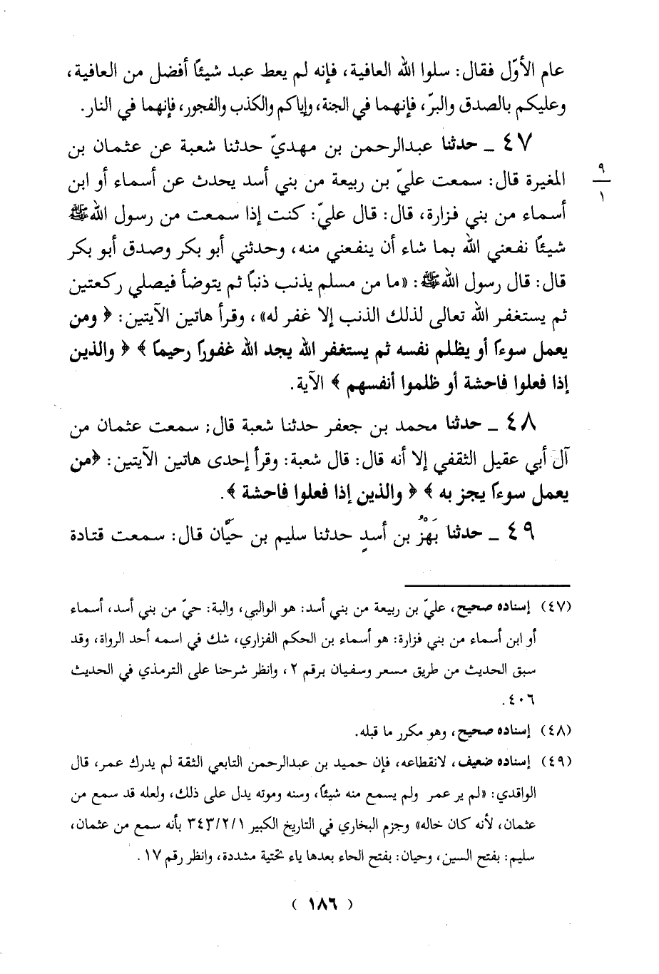 47 - حدثنا عبد الرحمن بن مهديّ حدثنا شعبة عن عثمان بن المغيرة قال: سمعت عليّ بن ربيعة من بني أسد يحدث عن أسماء أو ابن أسماء من بني فزارة، قال: قال عليّ: كنت إذا سمعت من رسول الله - صلى الله عليه وسلم - شيئاً نفعني الله بما شاء أن ينفعني منه، وحدثني أبو بكر وصدق أبو بكر