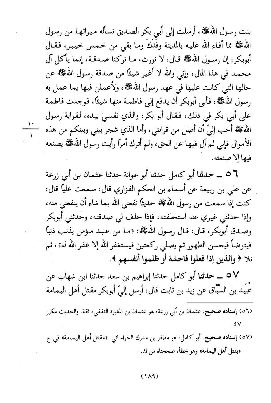 57 - حدثنا أبو كامل حدثنا إبراهيم بن سعد حدثنا ابن شهاب عن عُبَيد بن السَّبَّاق عن زيد بن ثابت قال: أرسل إليَّ أبو بكر مقتل أهل اليمامة