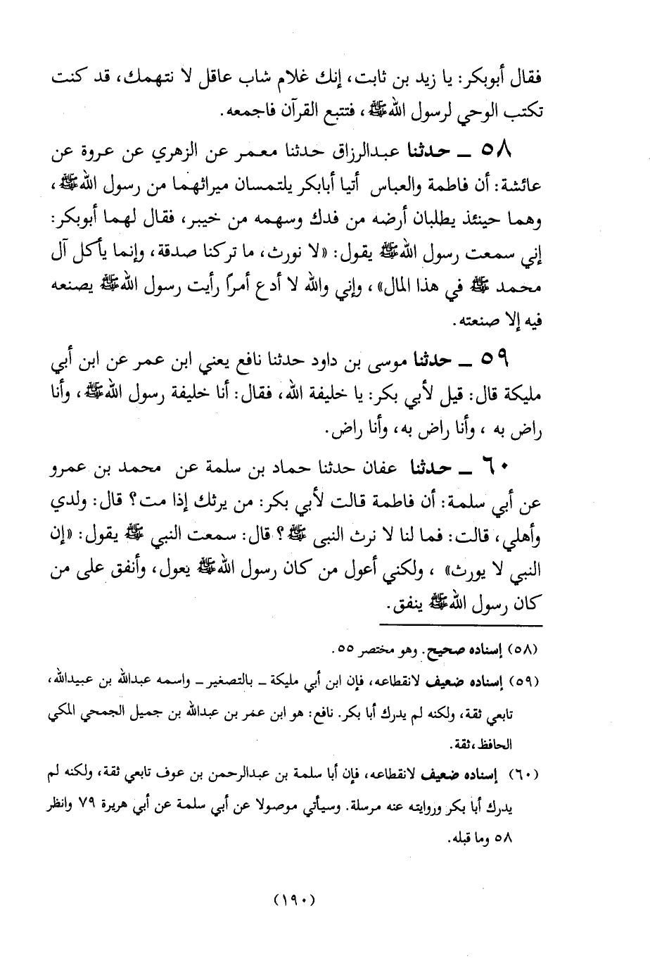 (59) إسناده ضعيف لانقطاعه، فإن ابن أبي مليكة- بالتصغير- واسمه عبد الله بن عبيد الله، تابعي ثقة، ولكنه لم يدرك أبا بكر. نافع: هو ابن عمر بن عبد الله بن جميل الجمحي المكى الحافظ، ثقة.