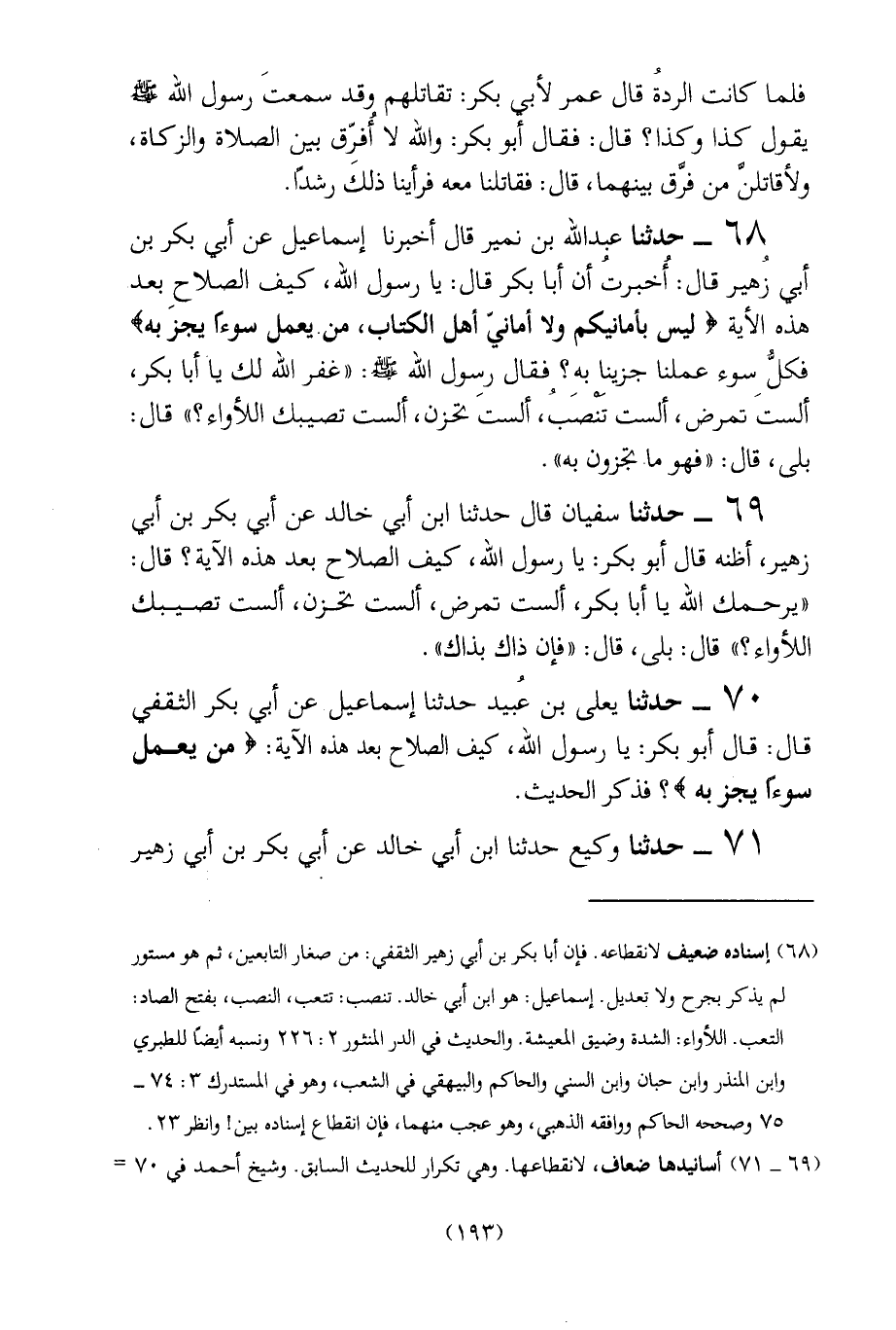 (69 - 71) أسانيدها ضعاف، لانقطاعها. وهي تكرار للحديث السابق. وشيخ أحمد في 70=