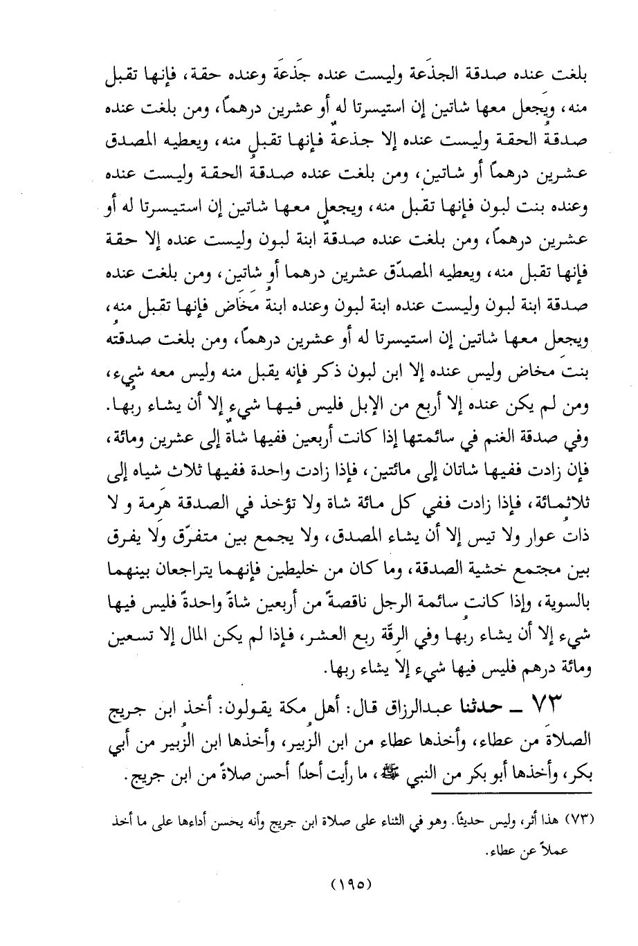 73 - حدثنا عبد الرزاق قال: أهل مكة يقولون: أخذ ابن جريج الصلاةَ من عطاء، وأخذها عطاء من ابن الزبير، وأخذها ابن الزبير من أبي بكر، وأخذها أبو بكر من النبى - صلى الله عليه وسلم -، ما رأيت أحداً، أحسن صلاةً من ابن جريج.
