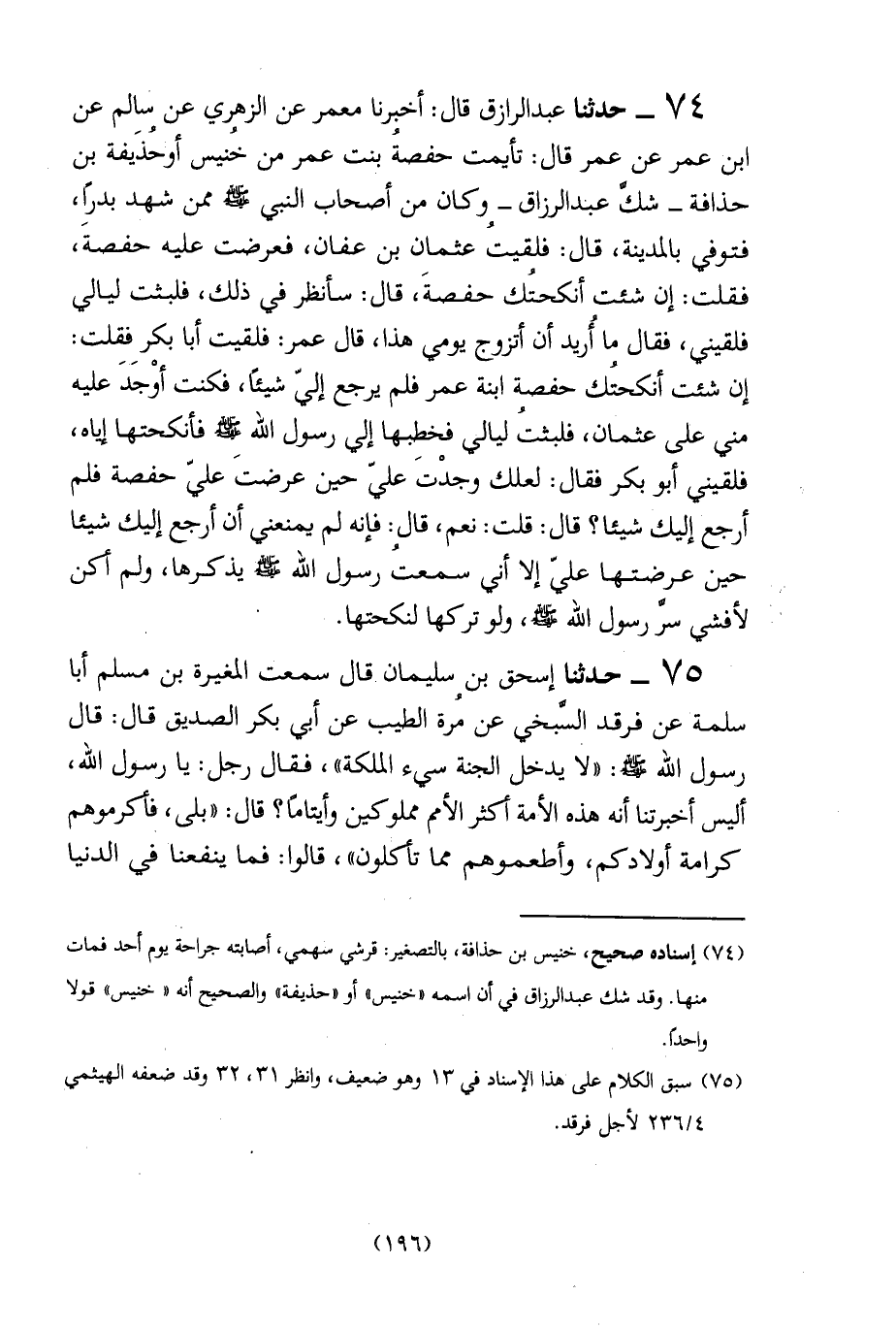 (74) إسناده صحيح، خنيس بن حذافة، بالتصغير: قرشى سهمى، أصابته جراحة يوم أحد فمات منها. وقد شك عبد الرزاق في أن اسمه "خنيس" أو "حذيفة" والصحيح أنه "خنيس" قولاً واحداً.