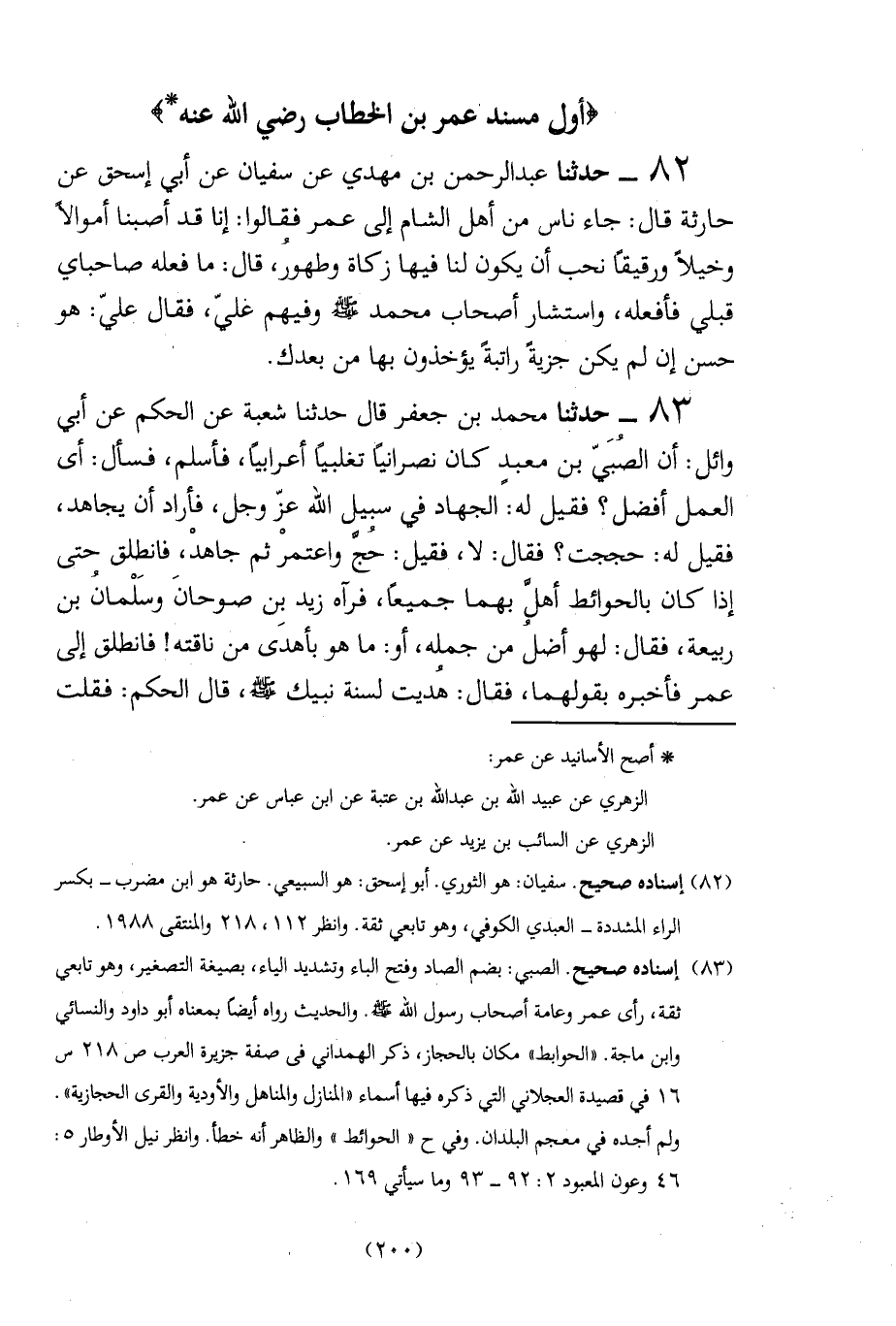 83 - حدثنا محمد بن جعفر قال حدثنا شعبة عن الحكم عن أبي وائل: أن الصُبَيَّ بن معبد كان نصرانياً تغلبياً أعرابياً، فأسلم، فسأل: أى العمل أفضل؟ فقيل له: الجهاد في سبيل الله عزّ وجل، فأراد أن يجاهد، فقيل له: حججت؟ فقال: لا، فقيل: حُجَّ واعتمرْ ثم جاهدْ، فانطلق حتى إذا كان بالحوائط أهلَّ بهما جميعًا، فرآه زيد بِن صوحانَ وسَلْمانُ بن ربيعة، فقال: لهو أضل من جمله، أو: ما هو بأهدى من ناقته! فانطلق إلى عمر فأخبره بقولهما، فقال: هُديت لسنة نبيك - صلى الله عليه وسلم -، قال الحكم: فقلت