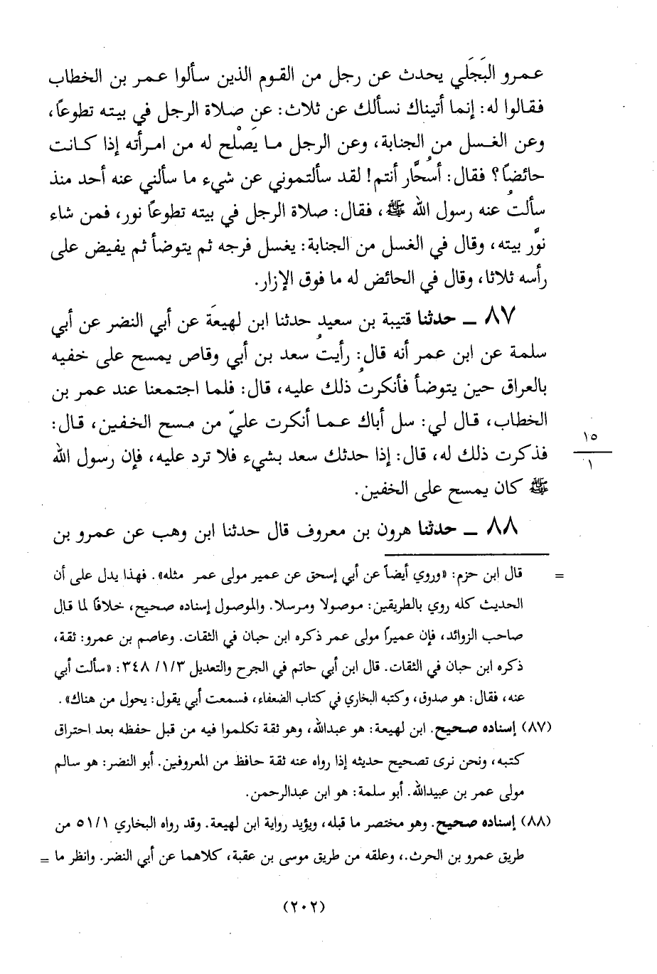 87 - حدثنا قتيبة بن سعيد حدثنا ابن لهيعَة عن أبي النضر عن أبي سلمة عن ابن عمر أنه قال: رأيت سعد بن أبي وقاص يمسح على خفيه بالعراق حين يتوضأ فأنكرت ذلك عليه، قال: فلما اجتمعنا عند عمر بن الخطاب، قال لي: سل أباك عما أنكرت عليّ من مسح الخفين، قال: فذكرت ذلك له، قال: إذا حدثك سعد بشيء فلا ترد عليه، فإن رسول الله - صلى الله عليه وسلم - كان يمسح على الخفين.