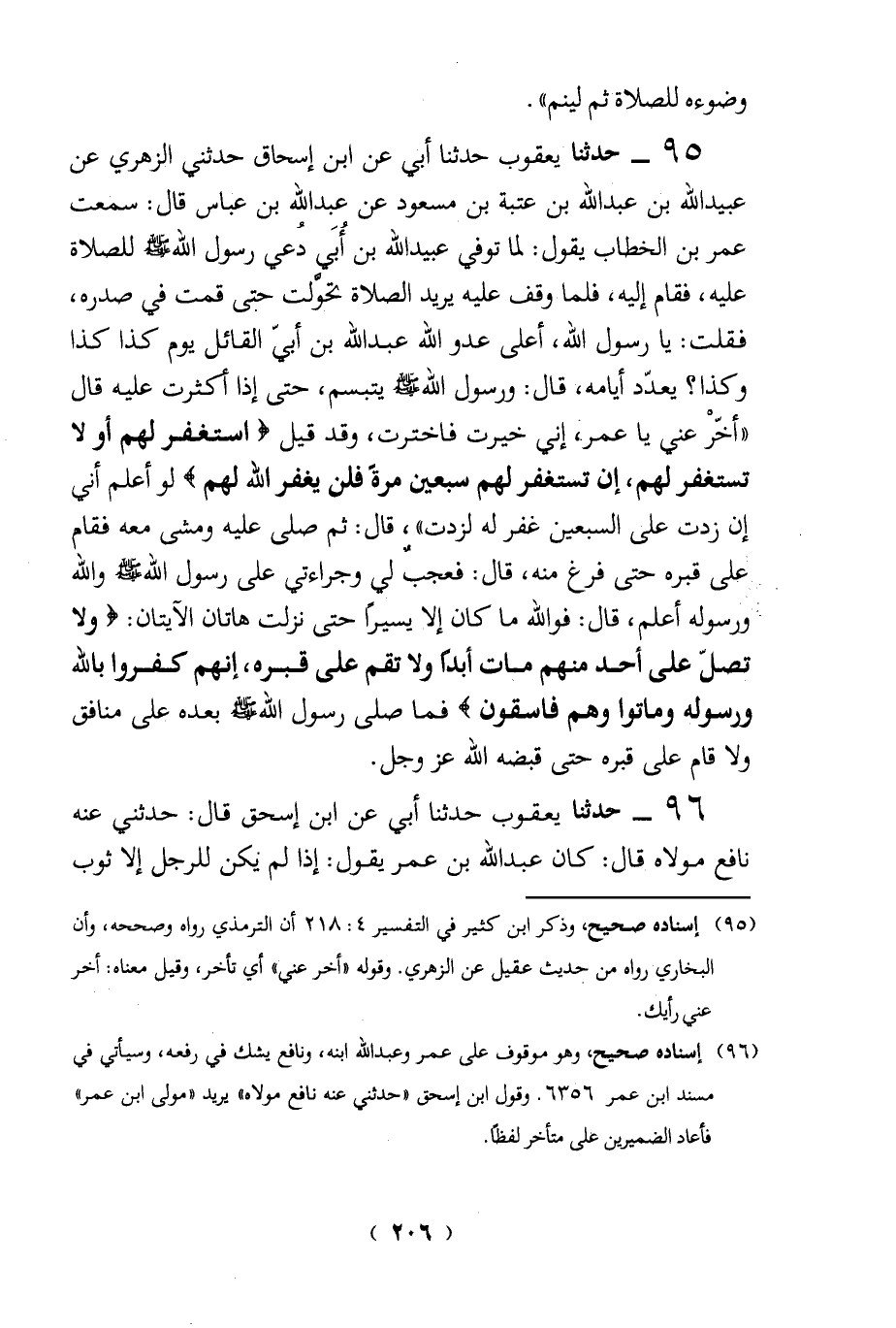 95 - حدثنا يعقوب حدثنا أبي عن ابن إسحاق حدثني الزهري عن عبيد الله بن عبد الله بن عتبة بن مسعود عن عبد الله بن عباس قال: سمعت عمر بن الخطاب يقول: لما توفي عبيد الله بن أُبي دُعى رسول الله - صلى الله عليه وسلم - للصلاة عليه، فقام إليه، فلما وقف عليه يريد الصلاة تحوَّلت حتى قمت في صدره، فقلت: يا رسول الله، أعلى عدو الله عبد الله بن أبي القائل يوم كذا كذا وكذا؟ يعدّد أيامه، قال: ورسول الله - صلى الله عليه وسلم - يتبسم، حتى إذا أكثرت عليه قال "أخّرْ عني يا عمر , إني خيرت فاخترت، وقد قيل {اسْتَغْفِرْ لَهُمْ أَوْ لَا تَسْتَغْفِرْ لَهُمْ إِنْ تَسْتَغْفِرْ لَهُمْ سَبْعِينَ مَرَّةً فَلَنْ يَغْفِرَ اللَّهُ لَهُمْ} لو أعلم أني إن زدت على السبعين غفر له لزدت"، قال: ثم صلى عليه ومشى معه فقام