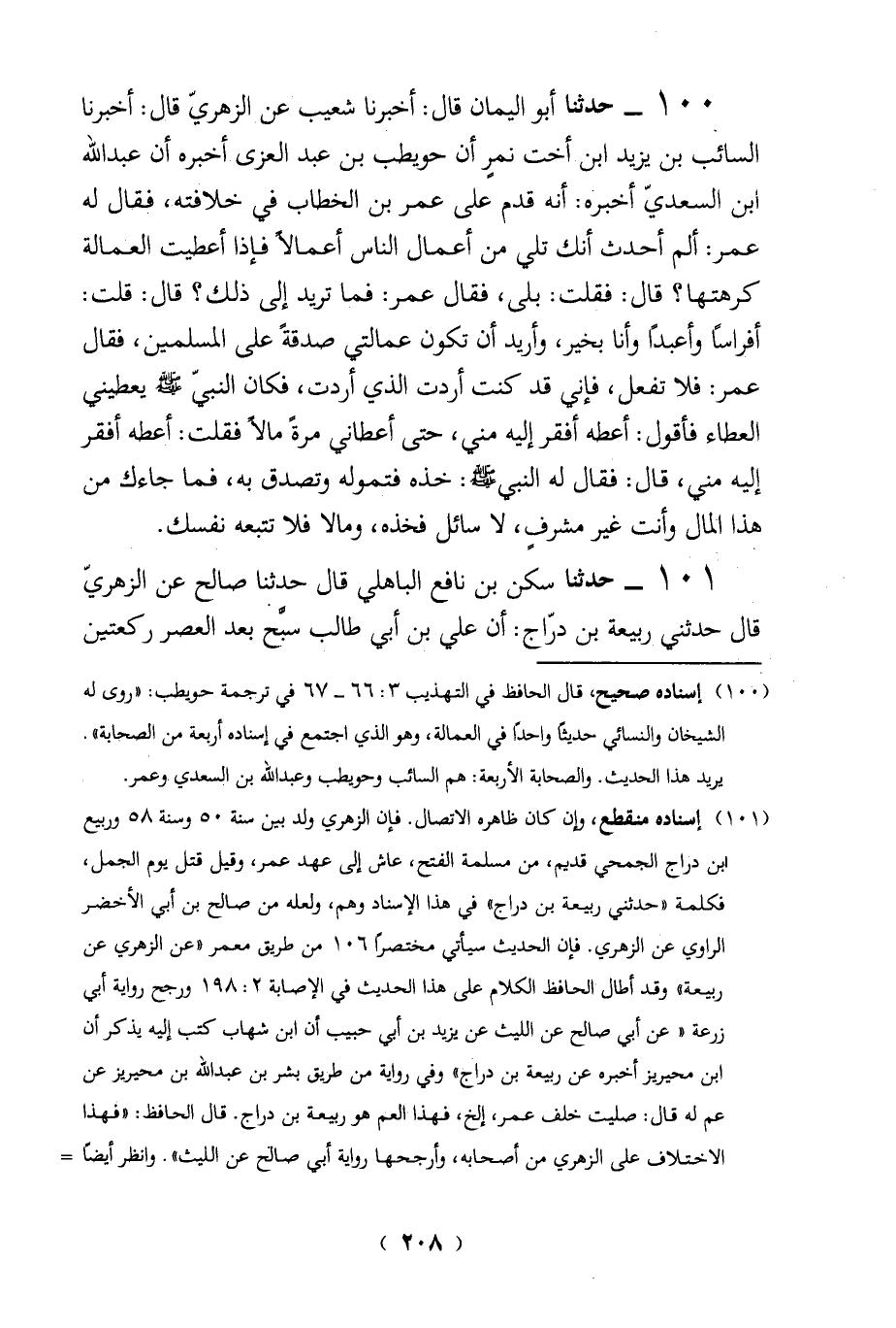 100 - حدثنا أبو اليمان قال: أخبرنا شعيب عن الزهريَّ قال: أخبرنا السائب بن يزيد ابن أخت نمرٍ أن حويطب بن عبد العزى أخبره أن عبد الله ابن السعديّ أخبره: أنه قدم على عمر بن الخطاب في خلافته، فقال له عمر: ألم أحدث أنك تلي من أعمال الناس أعمالاً فإذا أعطيت العمالة كرهتها؟ قال: فقلت: بلى، فقال عمر: فما تريد إلى ذلك؟ قال: قلت: أفراساً وأعبداً وأنا بخير، وأريد أن تكون عمالتي صدقةً على المسلمين، فقال عمر: فلا تفعل، فإني قد كنت أردت الذي أردت، فكان النبيّ - صلى الله عليه وسلم - يعطيني العطاء فأقول: أعطه أفقر إليه مني، حتى أعطاني مرةً مالاً فقلت: أعطه أفقر إليه منى، قال: فقال له النبي - صلى الله عليه وسلم -: خذه فتموله وتصدق به، فما جاءك من