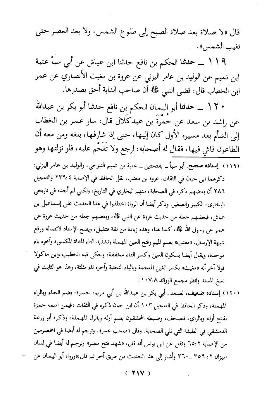 (119) إسناده صحيح. أبوسبأ- بفتحتين- عتبة بن تميم التنوخي، والوليد بن عامر اليزني: ذكرهما ابن حبان في الثقات. عروة بن معتب: نقل الحافظ في الإصابة 4: 239 والتعجيل 286 أن بعضهم ذكره في الصحابة، منهم البخاري في التاريخ، ولكني لم أجده في تاريخي البخاري: الكبير والصغير. وذكر أيضا أن الرواة اختلفوا في هذا الحديث على إسماعيل بن عياش، فبعضهم جعله من حديث عروة عن النبي - صلى الله عليه وسلم -، وبعضهم جعله من حديث عروة عن عمر عن رسول الله - صلى الله عليه وسلم -، كما هنا، وهذه زيادة من ثقة فتقبل، ويصح الإسناد لاتصاله ورفع شبهة الإرسال. "معتب" بضم الميم وفتح العين المهملة وتشديد التاء المثناة المكسورة وآخره باء موحدة، ويقال أيضا بسكون العين وكسر التاء مخففة، وحكى فيه الخطيب وابن ماكولا قولا آخر أنه "مغيث" بكسر الغين المعجمة وبالياء التحتية وآخره ثاء مثلثة، وهذا هو الثابت في نسخ المسند وانظر مجمع الزوائد 107:8.