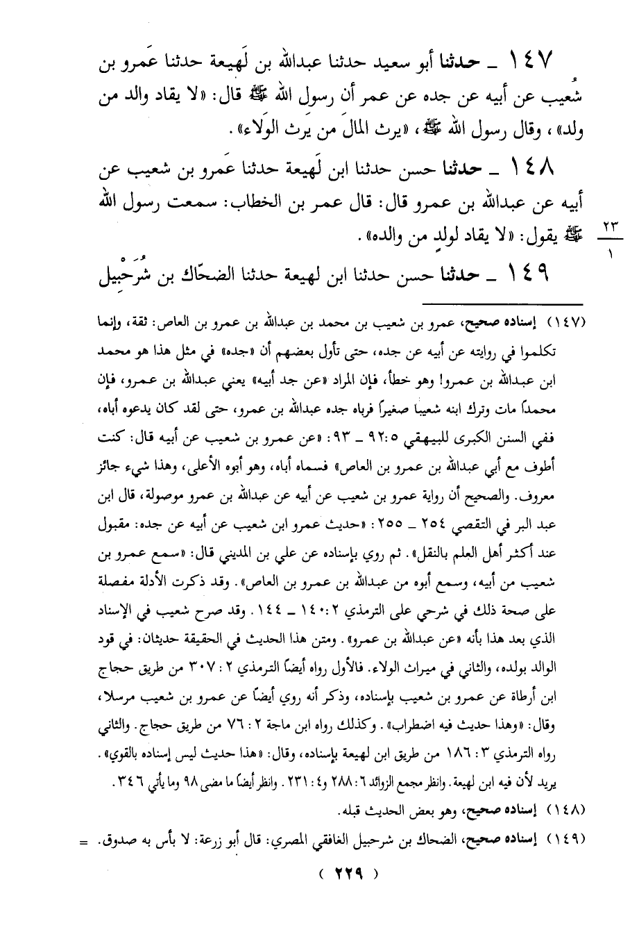147 - حدثنا أبو سعيد حدثنا عبد الله بن لَهيعة حدثنا عَمرو بن شُعيب عن أبيه عن جده عن عمر أن رسولِ الله - صلى الله عليه وسلم - قال: "لا يقاد والد من ولد"، وقال رسول الله - صلى الله عليه وسلم -، "يرث المالَ من يرث الوَلاء".