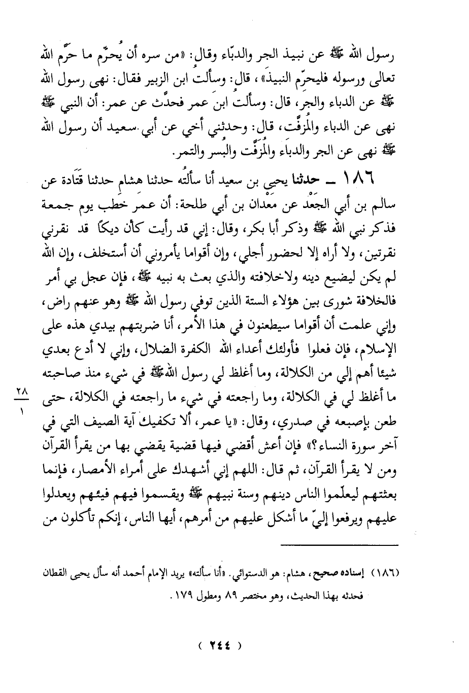 186 - حدثنا يحيى بن سعيد أنا سألتُه حدثنا هِشامِ حدثنا قَتَادة عن سالم بن أبي الجَعْد عن مَعْدان بن أبي طلحة: أن عمر خطب يوم جمعة فذكر نبي الله - صلى الله عليه وسلم - وذكر أبا بكر، وقال: إني قد رأيت كأن ديكاً قد نقرني نقرتين، ولا أراه إلا لحضور أجلي، وإن أقواما يأمروني أن أستخلف، وإن الله لم يكن ليضيع دينه ولا خلافته والذي بعث به نبيه - صلى الله عليه وسلم -، فإن عجل بي أمر فالخلافة شورى بين هؤلاء الستة الذين توفي رسول الله - صلى الله عليه وسلم - وهو عنهم راض، وإني علمت أن أقواما سيطعنون في هذا الأمر، أنا ضربتهم بيدي هذه على الإسلام، فإن فعلوا فأولئك أعداء الله الكفرة الضلال، وإني لا أدع بعدي شيئا أهم إلي من الكلالة، وما أغلظ لي رسول الله - صلى الله عليه وسلم - في شيء منذ صاحبته ما أغلظ لي في الكلالة، وما راجعته في شيء ما راجعته في الكلالة، حتى طعن بإصبعه في صدري، وقال: "يا عمر، ألا تكفيك آية الصيف التي في