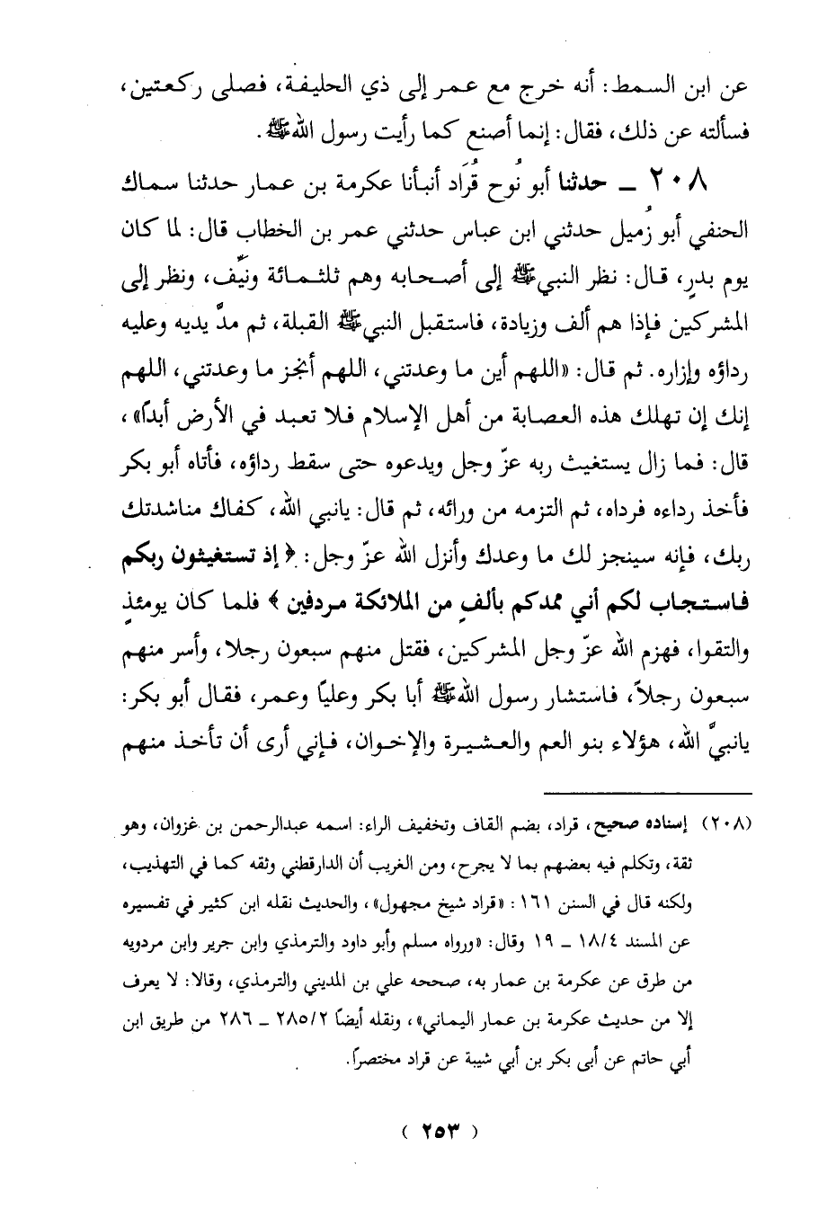 208 - حدثنا أبو نوح قُرَاد أنبأنا عكرمة بن عمار حدثنا سماك الحنفي أبو زُميل حدثنى ابن عباس حدثنى عمر بن الخطاب قال: لما كان يوم بدرٍ، قال: نظر النبي - صلى الله عليه وسلم - إلى أصحابه وهم ثلثمائة ونَيَّف، ونظر إلى المشركين فإذا هم ألف وزيادة، فاستقبل النبي - صلى الله عليه وسلم - القبلة، ثم مدَّ يديه وعليه رداؤه وإزاره. ثم قال: "اللهم أين ما وعدتنى، اللهم أنجز ما وعدتني، اللهم