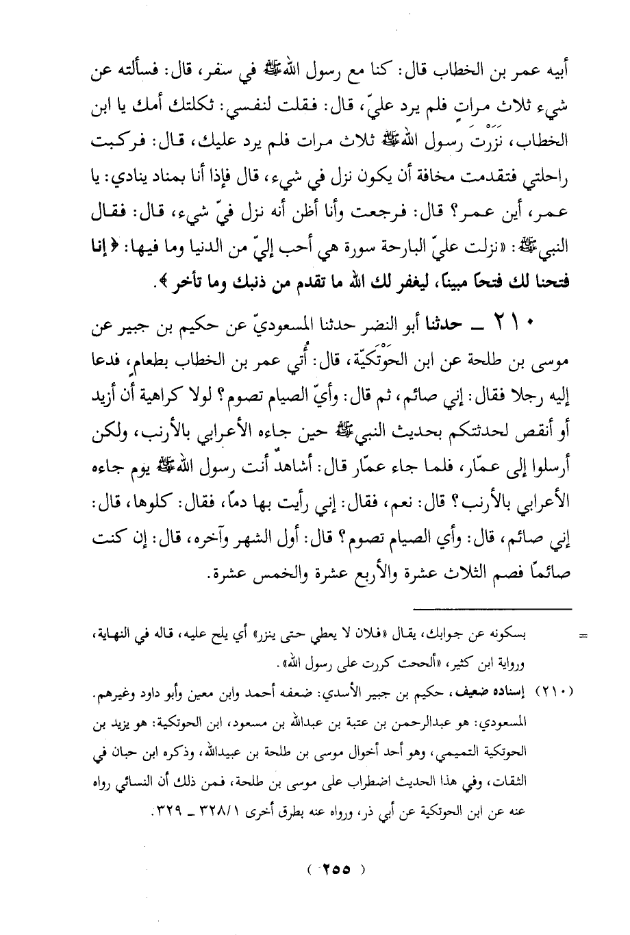210 - حدثنا أبو النضر حدثنا المسعوديّ عن حكيم بن جبير عن موسى بن طلحة عن ابن الحَوْتَكيّة، قال: أُتي عمر بن الخطاب بطعامٍ، فدعا إليه رجلا فقال: إنا صائم، ثم قال: وأيّ الصيام تصوم؟ لولا كراهية أن أزيد أو أنقص لحدثتكم بحديث النبي - صلى الله عليه وسلم - حين جاءه الأعرابي بالأرنب، ولكن أرسلوا إلى عمّار، فلما جاء عمّار قال: أشاهدٌ أنت رسول الله في يوم جاءه الأعرابي بالأرنب؟ قال: نعم، فقال: إني رأيت بها دماً، فقال: كلوها، قال: إني صائم، قال: وأي الصيام تصوم؟ قال: أول الشهر وآخره، قال: إن كنت صائمًا فصم الثلاث عشرة والأربع عشرة والخمس عشرة.