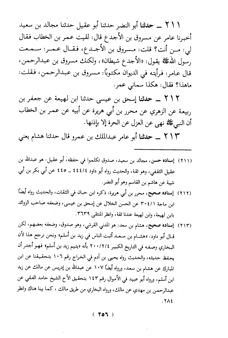 211 - حدثنا أبو النضر حدثنا أبو عقيل حدثنا مجالد بن سعيد أخبرنا عامر عن مسروق بن الأجدع قال: لقيت عمر بن الخطاب فقال لي: من أنت؟ قلت: مسروق بن الأجدع، فقال عمر: سمعت رسول الله - صلى الله عليه وسلم - يقول: "الأجدع شيطان"، ولكنك مسروق بن عبد الرحمن، قال عامر: فرأيته في الديوان مكتوباً: مسروق بن عبد الرحمن، فقلت: ماهذا؟ فقال: هكذا سماني عمر.