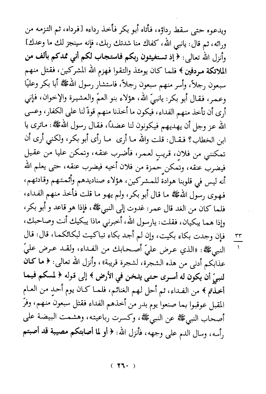 فيضرب عنقه، وتمكن حمزة من فلان أخيه فيضرب عنقه، حتى يعلم الله أنه ليس في قلوبنا- هوادةٌ للمشركين، هؤلاء صناديدهم وأئمتهم وقادتهم، فهوى رسول الله - صلى الله عليه وسلم - ما قال أبو بكر، ولم يهو ما قلت فأخذ منهم الفداء، فلما كان من الغد قال عمر: غدوت إلى النبي - صلى الله عليه وسلم -، فإذا هو قاعد وأبو بكر، وأذا هما يبكيان، فقلت: يارسول الله، أخبرني ماذا يبكيك أنت وصاحبك، فإن وجدت بكاء بكيت، وإن لم أجد بكاء تباكيت لبكائكما، قال: قال النبي - صلى الله عليه وسلم -: " الذي عرض عليّ أصحابك من الفداء، ولقد عرض عليّ عذابكم أدنى من هذه الشجرة، لشجرة قريبة"، وأنزل الله تعالى: {مَا كَانَ لِنَبِيٍّ أَنْ يَكُونَ لَهُ أَسْرَى حَتَّى يُثْخِنَ فِي الْأَرْضِ (67)} إلى قوله {لَمَسَّكُمْ فِيمَا أَخَذْتُمْ (68)} من الفداء، ثم أحل لهم الغنائم، فلما كان يوم أحدٍ من العام المقبل عوقبوا بما صنعوا يوم بدر من أخذهم الفداء فقتل سبعونً منهم، وفرّ أصحاب النبي - صلى الله عليه وسلم - عن النبي - صلى الله عليه وسلم -، وكسرت رباعيته، وهشمت البيضة على رأسه، وسال الدم على وجهه، فأنزل الله: {أَوَلَمَّا أَصَابَتْكُمْ مُصِيبَةٌ قَدْ أَصَبْتُمْ (165)}