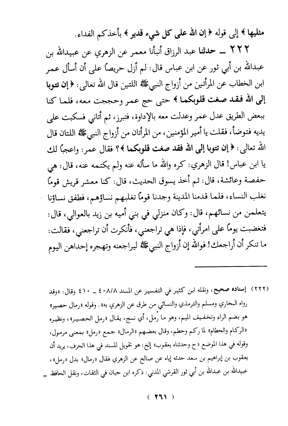 222 - حدثنا عبد الرزاق أنبأنا معمر عن الزهري عن عبيد الله بن عبد الله بن أبي ثور عن ابن عباس قال: لم أزل حريصاً على أن أسأل عمر ابن الخطاب عن المرأتين من أزواج النبي - صلى الله عليه وسلم - اللتين قال الله تعالى: {إِنْ تَتُوبَا إِلَى اللَّهِ فَقَدْ صَغَتْ قُلُوبُكُمَا} حتى حج عمر وحججت معه، فلما كنا ببعض الطريق عدل عمر وعدلت معه بالإداوة، فتبرز، ثبم أتاني فسكبت على يديه فتوضأ، فقلت يا أمير المؤمنين، من المرأتان من أزواج النبي - صلى الله عليه وسلم - اللتان قال الله تعالى: {إِنْ تَتُوبَا إِلَى اللَّهِ فَقَدْ صَغَتْ قُلُوبُكُمَا} فقال عمر: واعجباً لك يا ابن عباس! قال الزهري: كره والله ما سأله عنه ولم يكتمه عنه، قال: هي حفصة وعائشة، قال: ثم أخذ يسوق الحديث، قال: كنا معشر قريش قوماً نغلب النساء، فلما قدمنا المدينة وجدنا قوماً تغلبهم نساؤهم، فطفق نساؤنا يتعلمن من نسائهم، قال: وكان منزلي في بني أميه بن زيد بالعوالي، قال: فتغضبت يوماً على امرأتي، فإذا هي تراجعنى، فأنكرت أن تراجعني، فقالت: ما تنكر أن أراجعك! فوالله إن أزواج النبي - صلى الله عليه وسلم - ليراجعنه وتهجره إحداهن اليوم