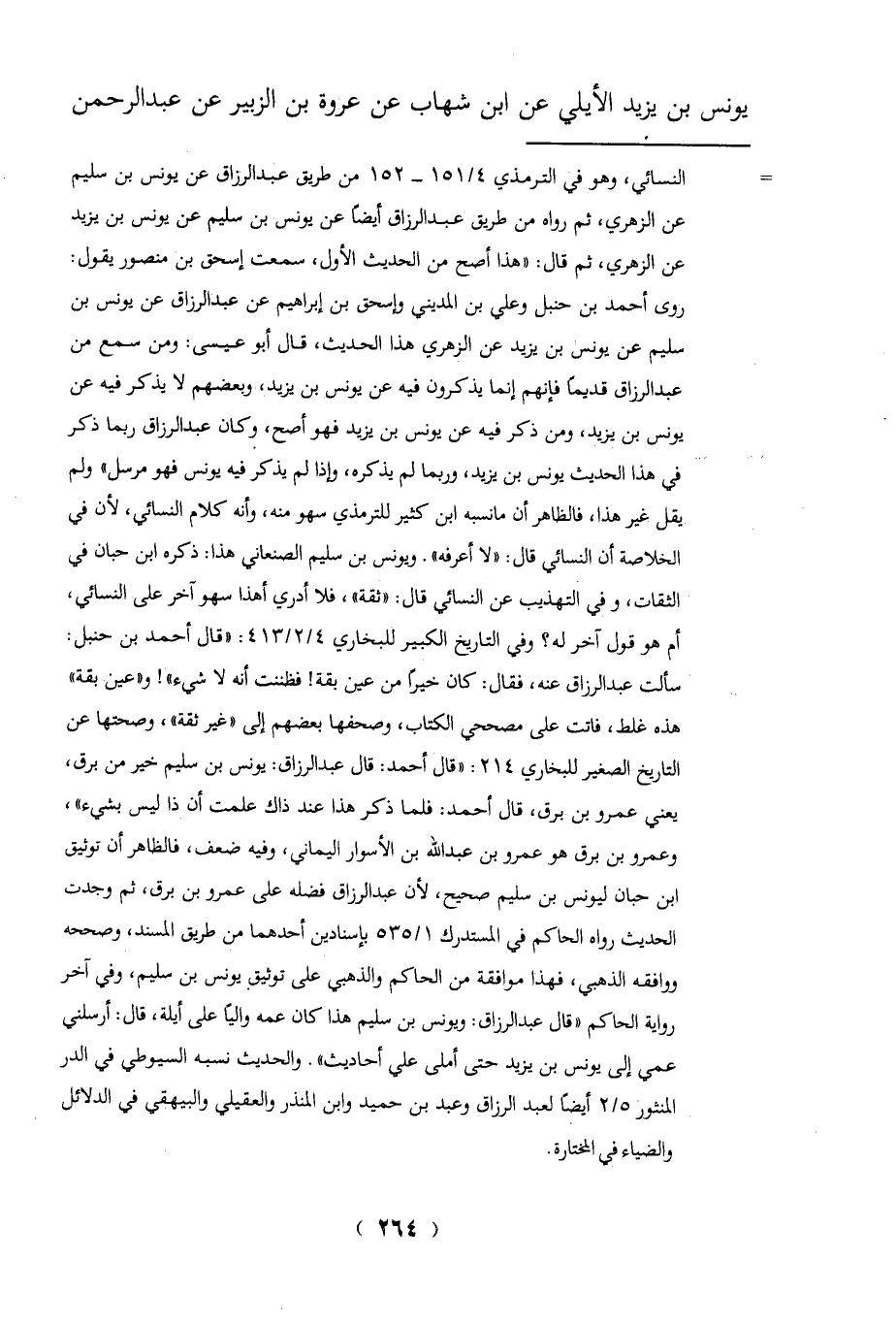 = النسائي، وهو في الترمذي 4/ 151 - 152 من طريق عبد الرزاق عن يونس بن سليم عن الزهري، ثم رواه من طريق عبد الرزاق أيضاً عن يونس بن سليم عن يونس بن يزيد عن الزهري، ثم قال: "هذا أصح من الحديث الأول، سمعت إسحق بن منصور يقول: روى أحمد بن حنبل وعلي بن المديني وإسحق بن إبراهيم عن عبد الرزاق عن يونس بن سليم عن يونس بن يزيد عن الزهري هذا الحديث، قال أبو عيسى: ومن سمع من عبد الرزاق قديماً فإنهم إنما يذكرون فيه عن يونس بن يزيد، وبعضهم لا يذكر فيه عن يونس بن يزيد، ومن ذكر فيه عن يونس بن يزيد فهو أصح، وكان عبد الرزاق ربما ذكر في هذا الحديث يونس بن يزيد، وربما لم يذكره، واذا لم يذكر فيه يونس فهو مرسل" ولم يقل غير هذا، فالظاهر أن ما نسبه ابن كثير للترمذي سهو منه، وأنه كلام النسائي، لأن في الخلاصة أن النسائي قال: "لا أعرفه". ويونس بن سليم الصنعاني هذا: ذكره ابن حبان في الثقات، وفي التهذيب عن النسائي قال: "ثقة"، فلا أدري أهذا سهو آخر على النسائي، أم هو قول آخر له؟ وفى التاريخ الكبير للبخاري4/ 2/ 413: "قال أحمد بن حنبل: سألت عبد الرزاق عنه، فقال: كان خير، من عين بقة! فظننت أنه لا شيء"! و"عين بقة" هذه غلط، فاتت على مصححي الكتاب، وصحفها بعضهم إلى "غير ثقة"، وصحتها عن التاريخ الصغير للبخاري 214: " قال أحمد: قال عبد الرزاق: يونس بن سليم خير من برق، يعني عمرو بن برق، قال أحمد: فلما ذكر هذا عند ذاك علمت أن ذا ليس بشيء"، وعمرو بن برق هو عمرو بن عبد الله بن الأسوار اليماني، وفيه ضعف، فالظاهر أن توثيق ابن حبان ليونس بن سليم صحيح، لأن عبد الرزاق فضله على عمرو بن برق، ثم وجدت الحديث رواه الحاكم في المستدرك 1/ 535 بإسنادين أحدهما من طريق السند، وصححه ووافقه الذهبي، فهذا موافقة من الحاكم والذهبي على توثيق يونس بن سليم، وفى آخر رواية الحاكم "قال عبد الرزاق: ويونس بن سليم هذا كان عمه والياً على أيلة، قال: أرسلني عمي إلى يونس بن يزيد حتى أملى علي أحاديث". والحديث نسبه السيوطي في الدر المنثور 5/ 2 أيضاً لعبد الرزاق وعبد بن حميد وابن المنذر والعقيلي والبيهقي في الدلائل والضياء في المختارة.