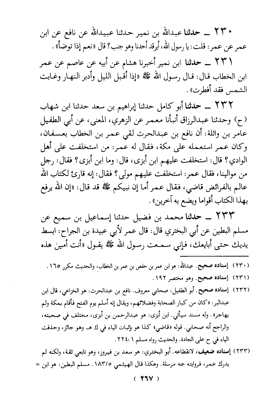 (232) إسناده صحيح. أبو الطفيل: صحابي معروف. نافع بن عبد الحرث: هو الخزاعي، قال ابن عبد البر: "كان من كبار الصحابة وفضلائهم، ويقال إنه أسلم يوم الفتح فأقام بمكة ولم يهاجر". وله مسند سيأتي. ابن أبزى: هو عبد الرحمن بن أبزى، مختلف في صحبته، والراجح أنه صحابي. قوله "قاضي" كذا هو بإثبات الياء في ك هـ وهو جائز، وحذفت الياء في ح على الجادة. والحديث رواه مسلم224:1.