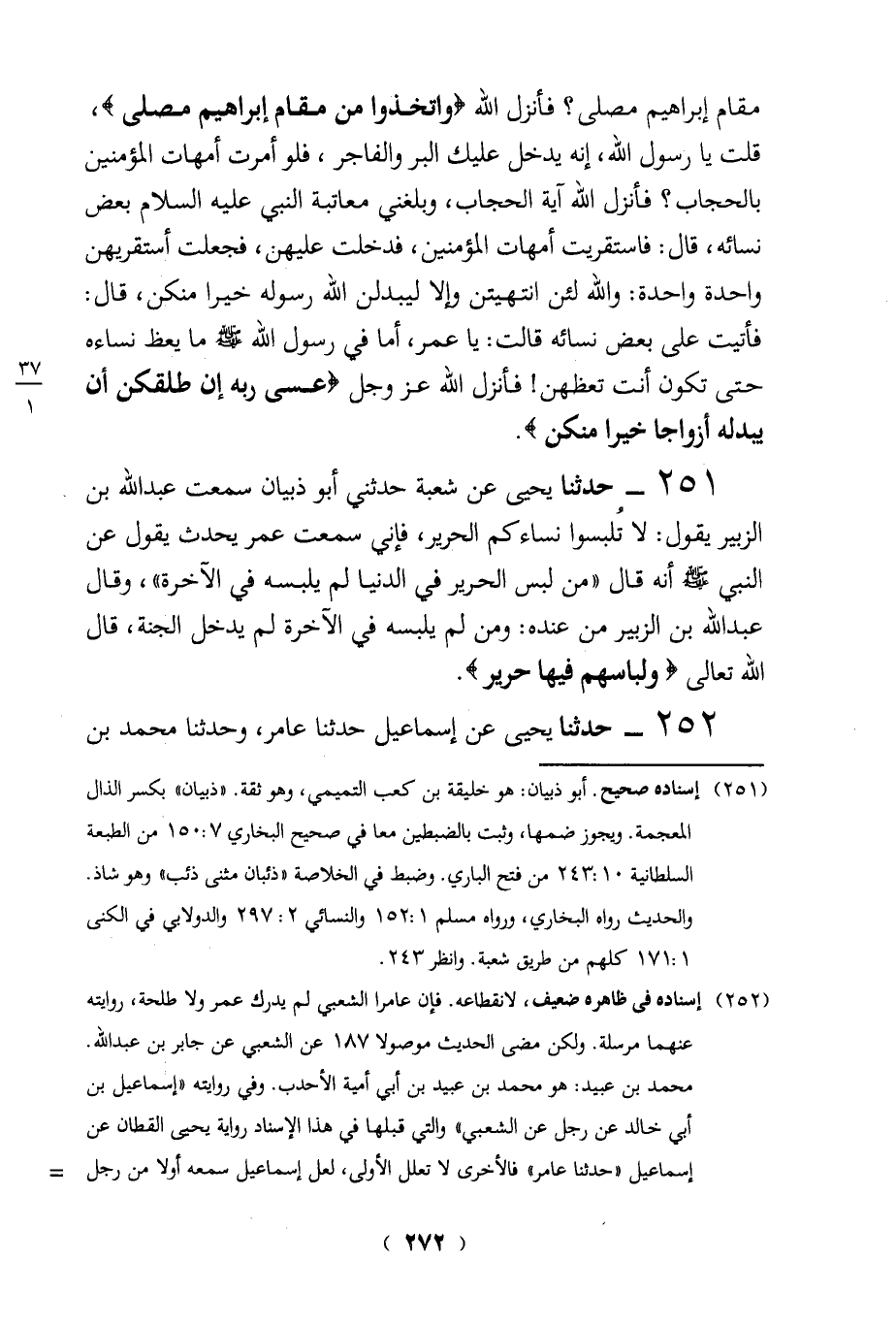 251 - حدثنا يحيى عن شعبة حدثني أبو ذبيان سمعت عبد الله بن الزبير يقول: لا تُلبسوا نساءكم الحرير، فإني سمعت عمر يحدث يقول عن النبي - صلى الله عليه وسلم - أنه قال "من لبس الحرير في الدنيا لم يلبسه في الآخرة"، وقال عبد الله بن الزبير من عنده: ومن لم يلبسه في الآخرة لم يدخل الجنة، قال الله تعالى {وَلِبَاسُهُمْ فِيهَا حَرِيرٌ}.