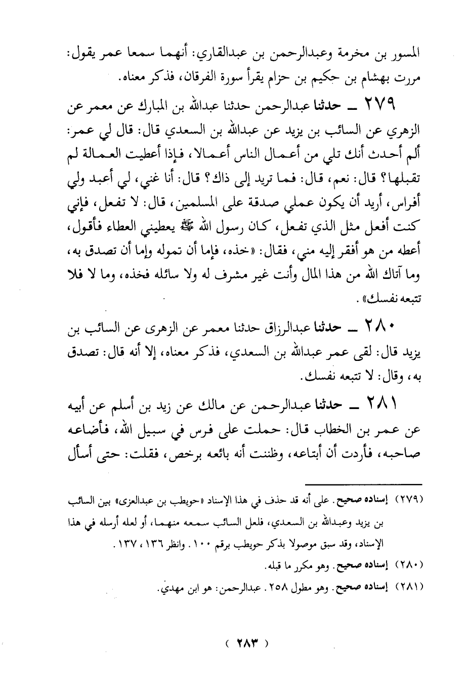 279 - حدثنا عبد الرحمن حدثنا عبد الله بن المبارك عن معمر عن الزهري عن السائب بن يزيد عن عبد الله بن السعدي قال: قال لي عمر: ألم أحدث أنك تلى من أعمال الناس أعمالا، فإذا أعطيت العمالة لم تقبلها؟ قال: نعم، قال: في تريد إلى ذاك؟ قال: أنا غني، لي أعبد ولي أفراس، أريد أن يكون عملي صدقة على المسلمين، قال: لا تفعل، فإني كنت أفعل مثل الذي تفعل، كان رسول الله - صلى الله عليه وسلم - يعطيني العطاء فأقول، أعطه من هو أفقر إليه مني، فقال: "خذه، فإما أن تموله وإما أن تصدق به، وما آتاك الله من هذا المال وأنت غير مشرف له ولا سائله فخذه، وما لا فلا تتبعه نفسك".