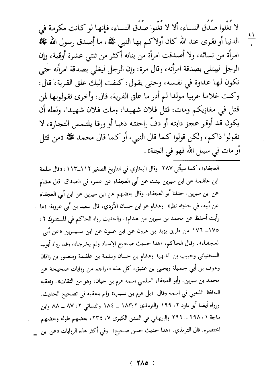 السختياني وحبيب بن الشهيد وهشام بن حسان وسلمة بن علقمة ومنصور بن زاذان وعوف بن أبي جميلة ويحيى بن عتيق، كل هذه التراجم من روايات صحيحة عن محمد بن سيرين. وأبو العجفاء السلمي اسمه هرم بن حيان، وهو من الثقات". وتعقبه الحافظ الذهبى في اسمه وقال: "بل هرم بن نسيب" ولم يتعقبه في تصحيح الحديث.