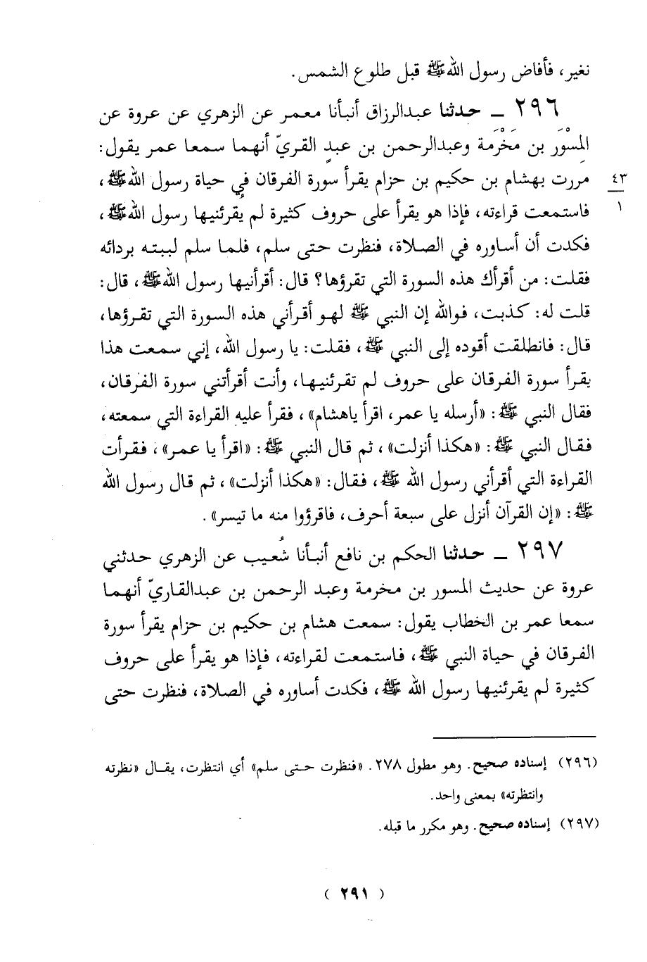 297 - حدثنا الحكم بن نافع أنبأنا شعيب عن الزهري حدثني عروة عن حديث المسور بن مخرمة وعبد الرحمن بن عبد القاريّ أنهما سمعا عمر بن الخطاب يقول: سمعت هشام بن حكيم بن حزام يقرأ سورة الفرقان في حياة النبي - صلى الله عليه وسلم -، فاستمعت لقراءته، فإذا هو يقرأ على حروف