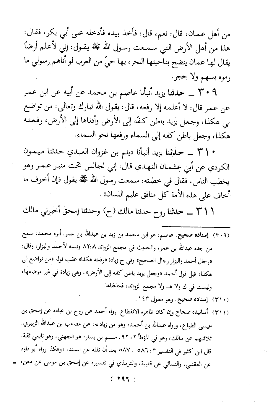 (311) أسانيده صحاح وإن كان ظاهره الانقطاع. رواه أحمد عن روح بن عبادة عن إسحق بن عيسى الطباع، ورواه عبد الله بن أحمد، وهو من زياداته، عن مصعب بن عبد الله الزبيري.