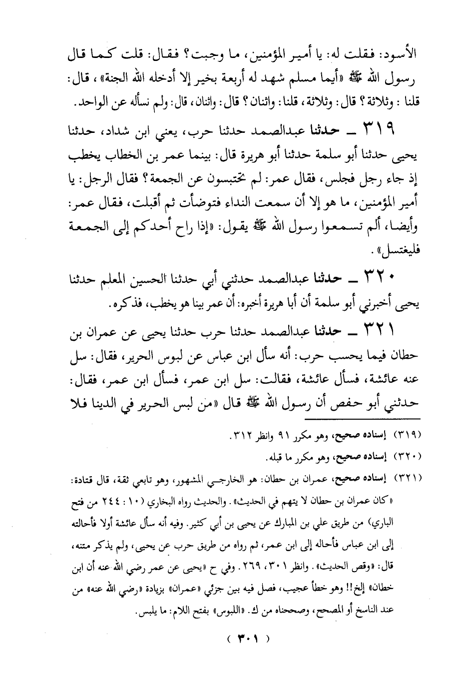 321 - حدثنا عبد الصمد حدثنا حرب حدثنا يحيى عن عمران بن حطان فيما يحسب حرب: أنه سأل ابن عباس عن لبوس الحرير، فقال: سل عنه عائشة، فسأل عائشة، فقالت: سل ابن عمر، فسأل ابن عمر، فقال: حدثنى أبو حفص أن رسول الله - صلى الله عليه وسلم - قال "من لبس الحرير في الدينا فلا